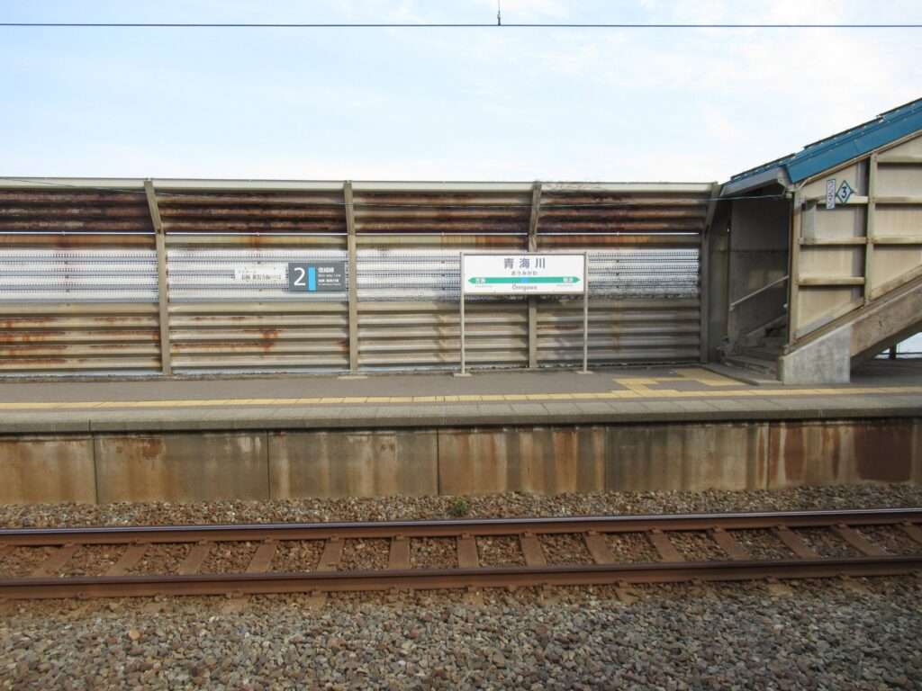 青海川駅(おうみがわえき)は、新潟県柏崎市大字青海川にある、東日本旅客鉄道(JR東日本)信越本線の駅である。同じくJR東日本の駅である鶴見線(海芝浦支線)海芝浦駅・仙石線陸前大塚駅等と共に、「日本一海に近い所にある駅」と言われる。プラットホームから見える、日本海に夕陽が沈む光景は、日本一美しいと謳われる。相対式ホーム2面2線を有する地上駅。両ホームは跨線橋で連絡している。長岡駅管理の無人駅。ホームが海岸段丘下に沿って設置されているため狭い。下り線2番線側が日本海に面している。2007年(平成19年)7月16日10時13分に発生した新潟県中越沖地震で、当駅に隣接した崖及び法面の大規模崩落が起こり、プラットホームの一部と線路、架線が土砂によって埋まる(または切断される)と言う被害を受けた。この被災により、海側プラットホームの基礎が10数cmずれ、外側に歪んでしまった。復旧工事においては駅舎(待合室)を撤去した上で、セメントサイロを建てる等、かなり大規模となった。新潟県では当駅付近の崖崩れが起きた箇所について、鉄筋コンクリートで固めたり、線路脇に鉄柵を設置したりして線路への土砂侵入を防止する等、新潟県中越沖地震を受け、災害防止のための工事を本格的に進めた結果、2008年(平成20年)3月に全工事が完了した。2008年(平成20年)3月25日に新駅舎が完成、使用を開始した。周辺には遊歩道が整備されており、恋人岬をはじめとした観光スポットが多く存在する。