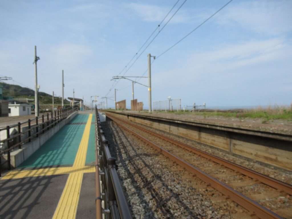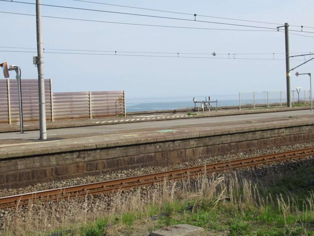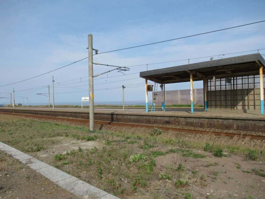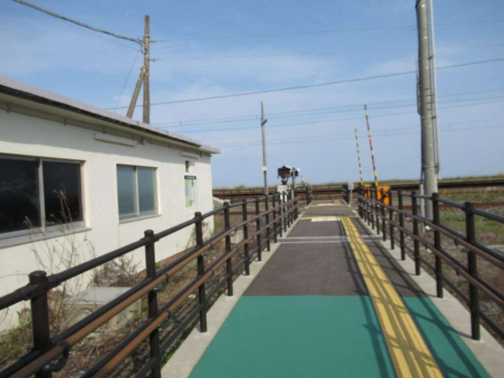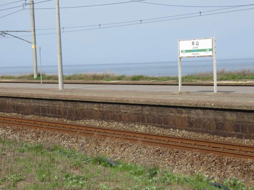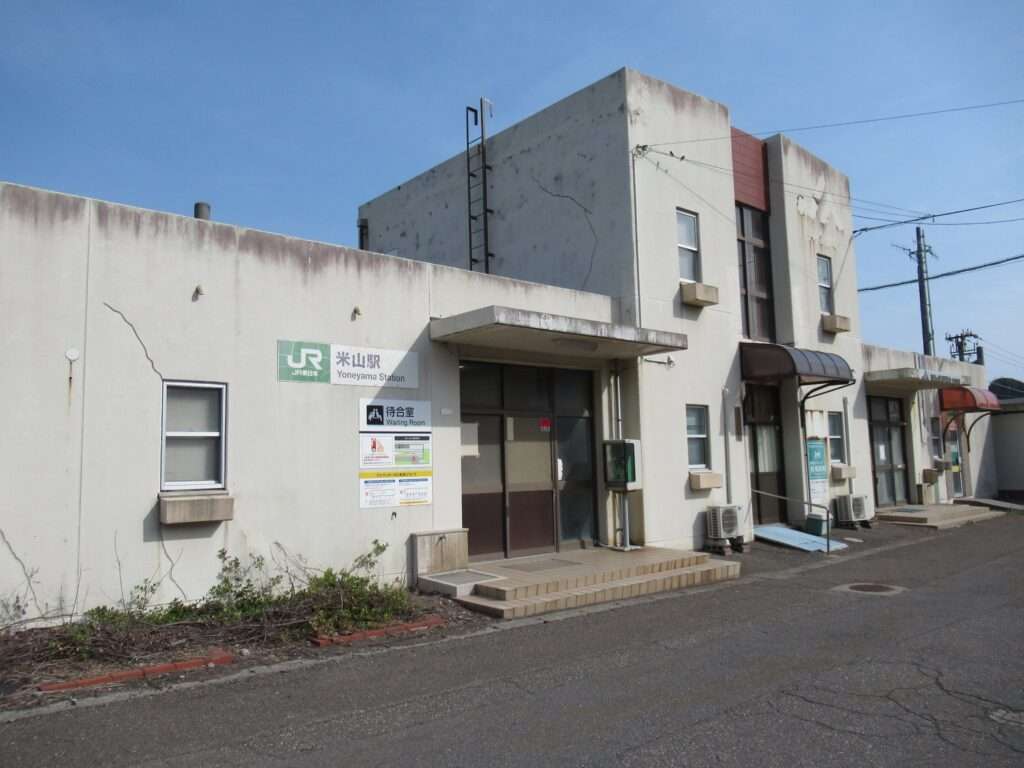 信越本線の米山駅でございます。複線電化区間にある、元は単式島式複合型の2面3線、いわゆる国鉄型配線だったうち島式ホーム層が夜を廃止した地上駅で、鉄筋コンクリートの駅舎がある無人駅となっております。各ホームへは駅舎とはまったく別の出入り口から入る遮断機付きの構内踏切で連絡しております。