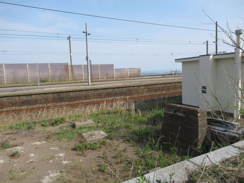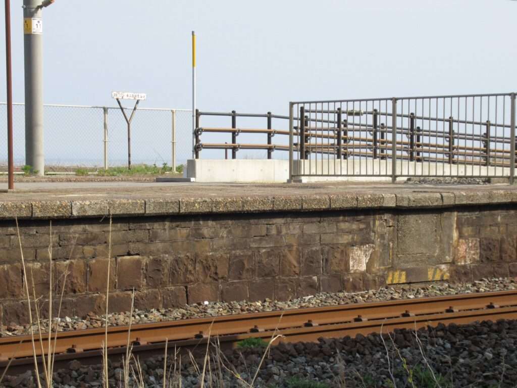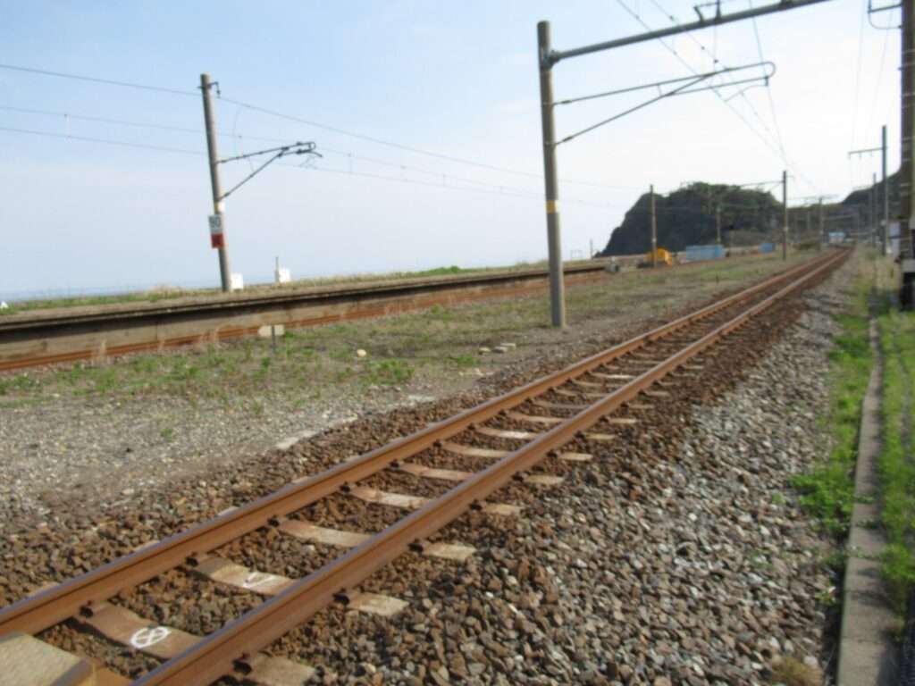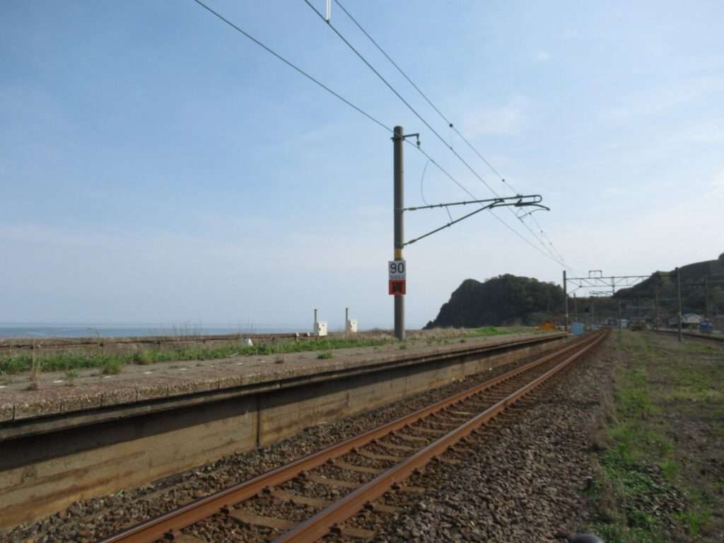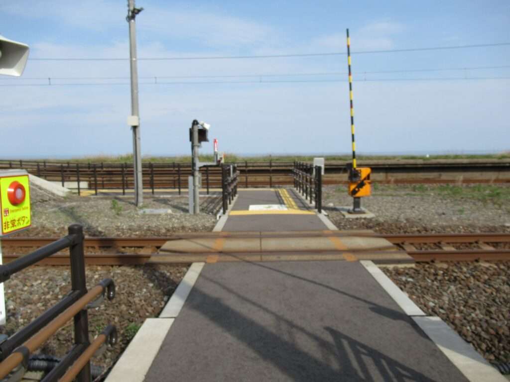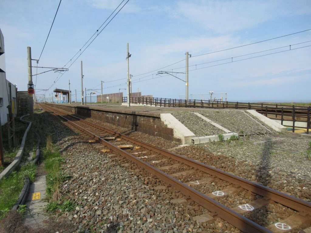 信越本線の米山駅でございます。複線電化区間にある、元は単式島式複合型の2面3線、いわゆる国鉄型配線だったうち島式ホーム層が夜を廃止した地上駅で、鉄筋コンクリートの駅舎がある無人駅となっております。各ホームへは駅舎とはまったく別の出入り口から入る遮断機付きの構内踏切で連絡しております。