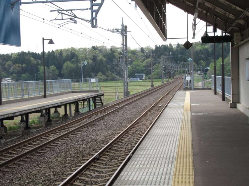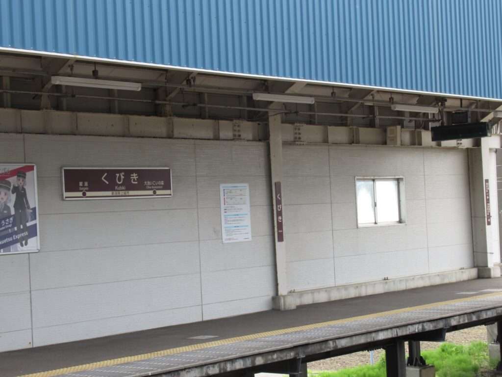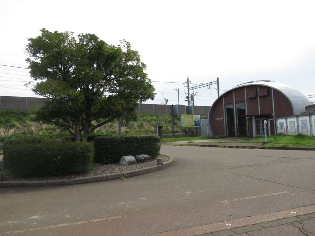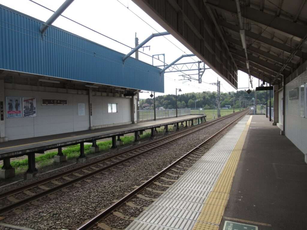 全線単線電化の路線、北越急行ほくほく線のくびき駅でございます。奇抜な近未来的デザインの半卵型ドーム状の駅舎がある無人駅で、列車交換可能な1線スルー化された相対式2面2線の高架駅となっております。駅舎からホームへは階段で連絡しております。