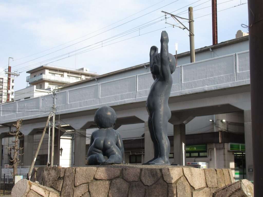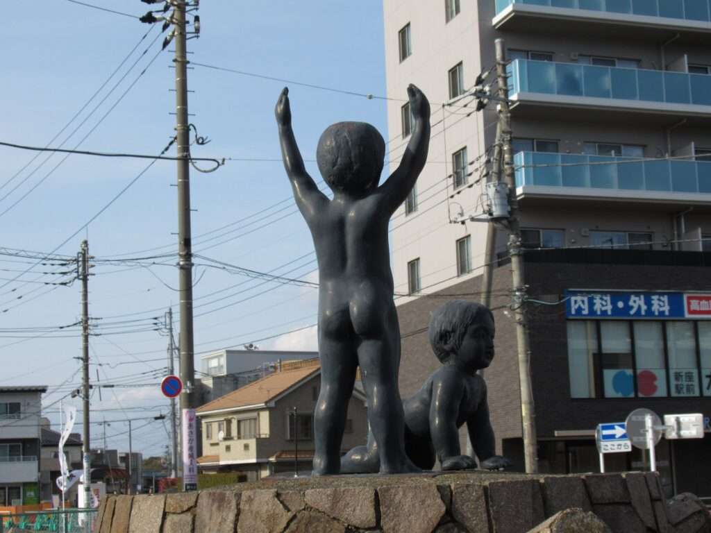 武蔵野線の新座駅の北口ロータリーの中央にあった二人の赤ちゃんの像でございます。一人の赤ちゃんが両手を挙げてます。タイトルも作者も不明なんでこっちもお手上げっすよなんてね(←やかましw)。