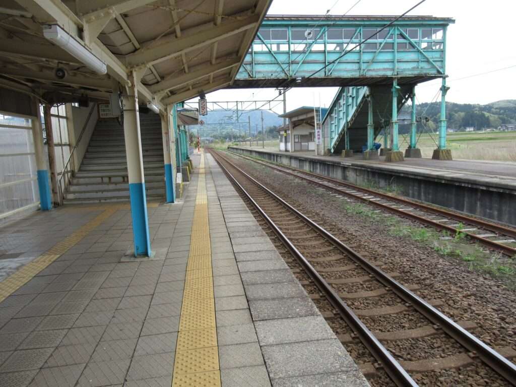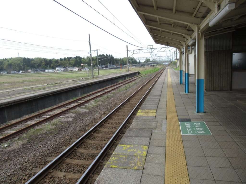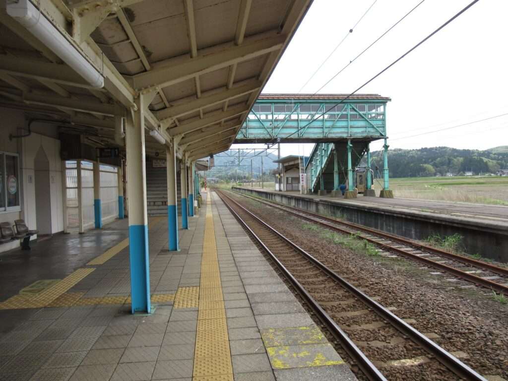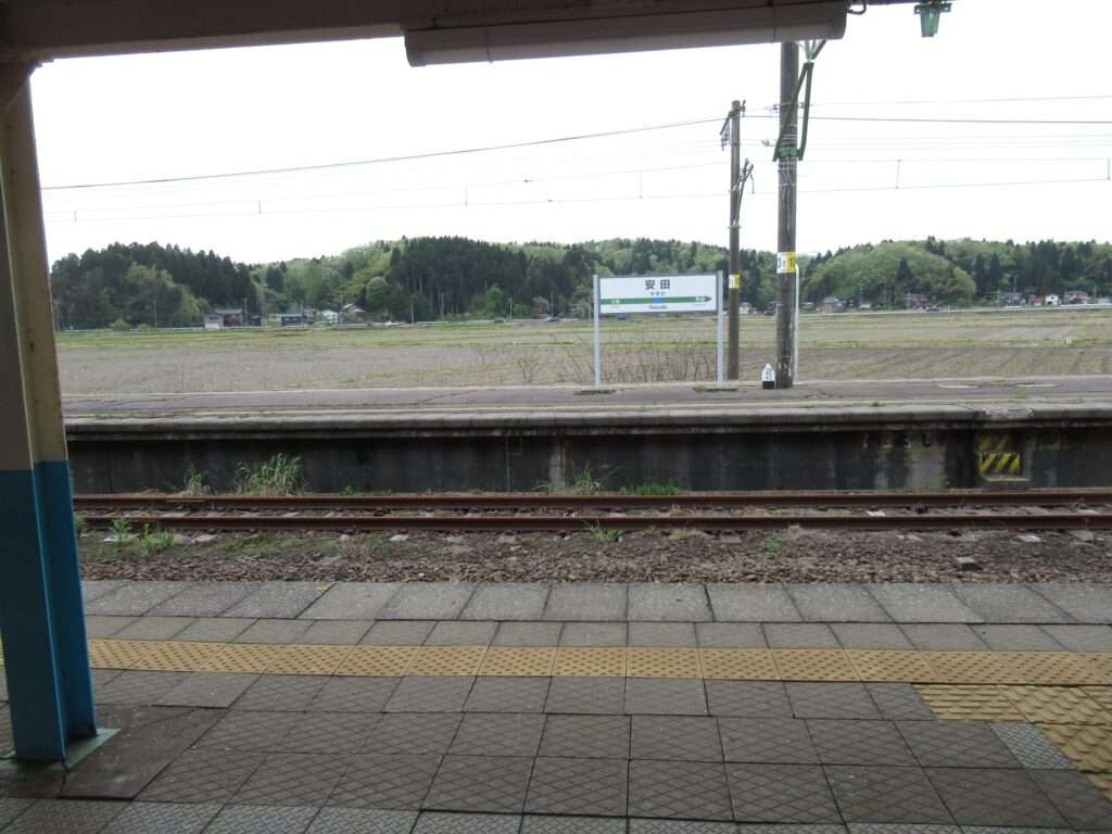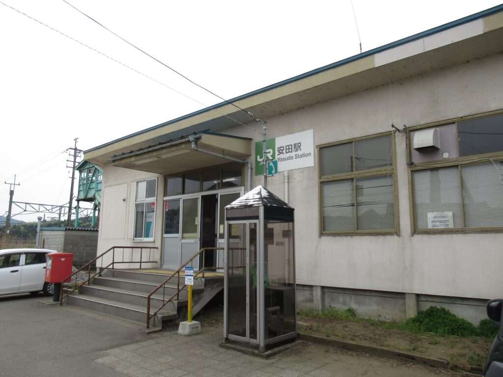 信越本線の安田駅でございます。複線電化区間にある単式島式複合型の2面3線、いわゆる国鉄型配線の地上駅で、中線はレールが残され繋がっているものの架線は撤去され、保守用にのみ使用されているため実質は単式2面2線となっております。平屋の駅舎がある無人駅で、ホーム間は上屋付きの跨線橋で連絡しております。新潟産業大学、新潟産業大学附属高等学校などの最寄り駅となっております。