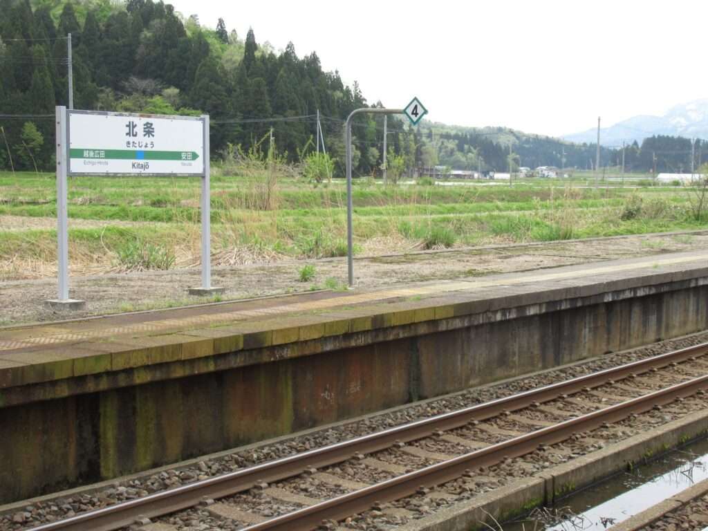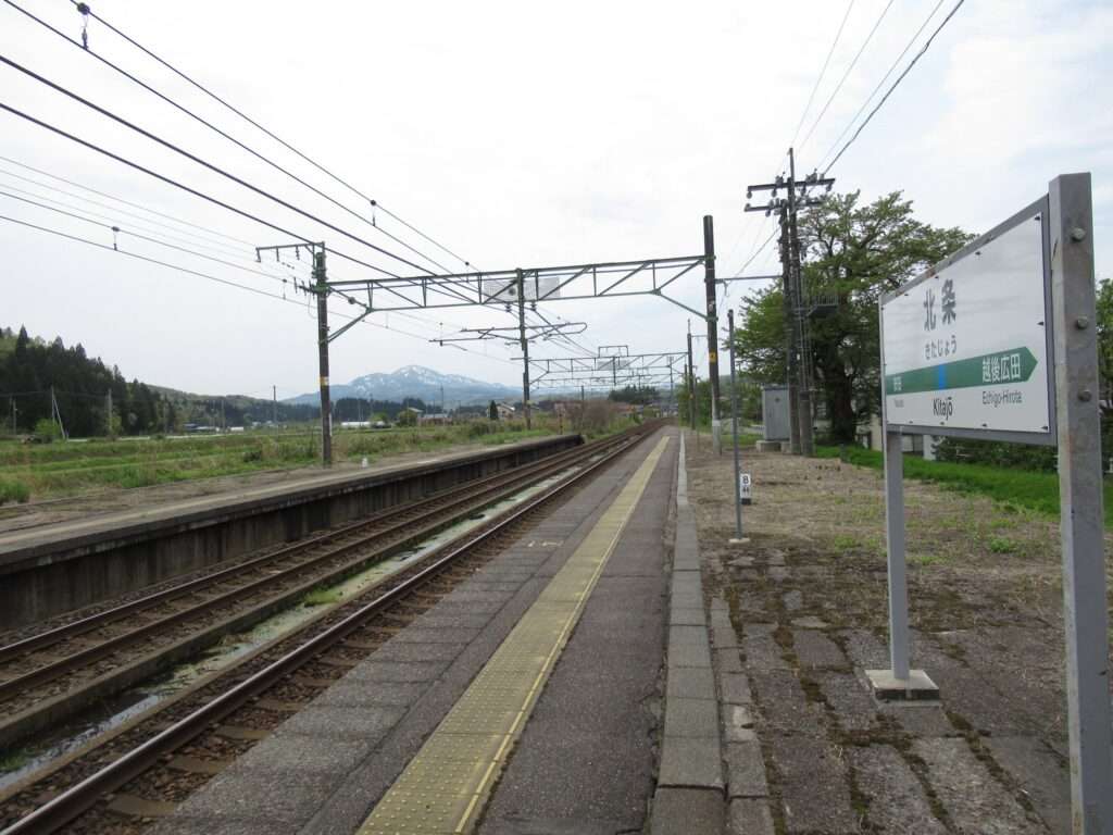 信越本線の北条駅でございます。複線電化区間にある相対式2面2線の地上駅で、武家屋敷風の和風デザインの平屋駅舎がある無人駅となっております。ホーム間は上屋付きの跨線橋で連絡しております。駅名の読みは「ほうじょう」とかではなく「きたじょう」でございます。ここへ来たじょ~、なんちゃって(←大概にせえやジジイw)。