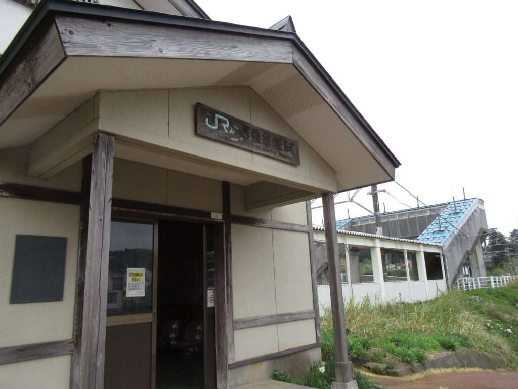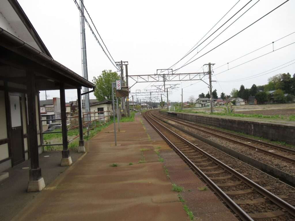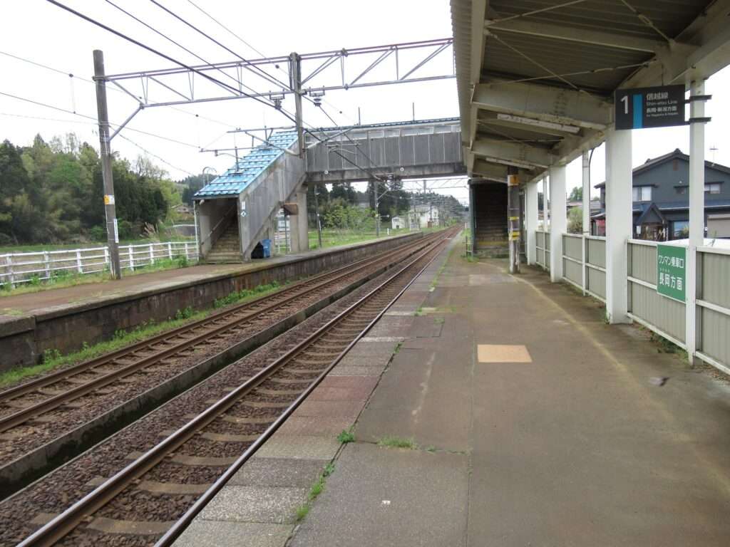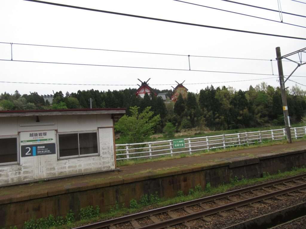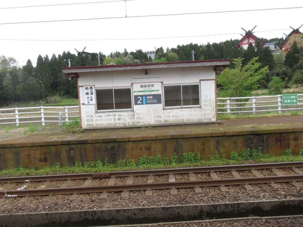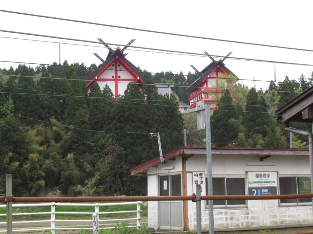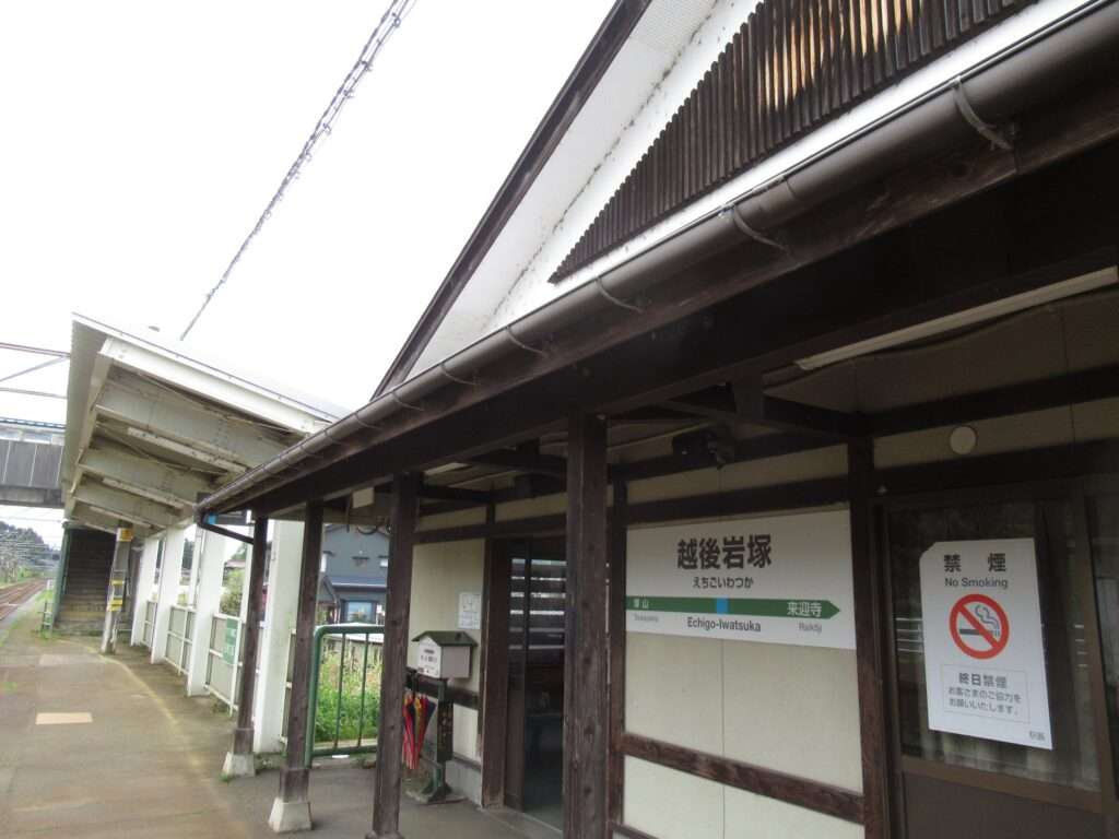 信越本線の越後岩塚駅でございます。複線電化区間にある相対式2面2線の地上駅で、平屋の駅舎がある無人駅となっております。ホーム間は上屋付きの跨線橋で連絡しております。宝徳山稲荷大社の最寄り駅で、駅から神殿が見えております。