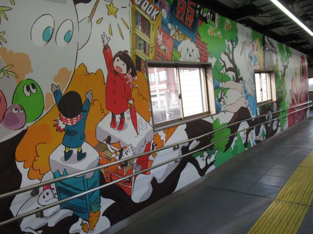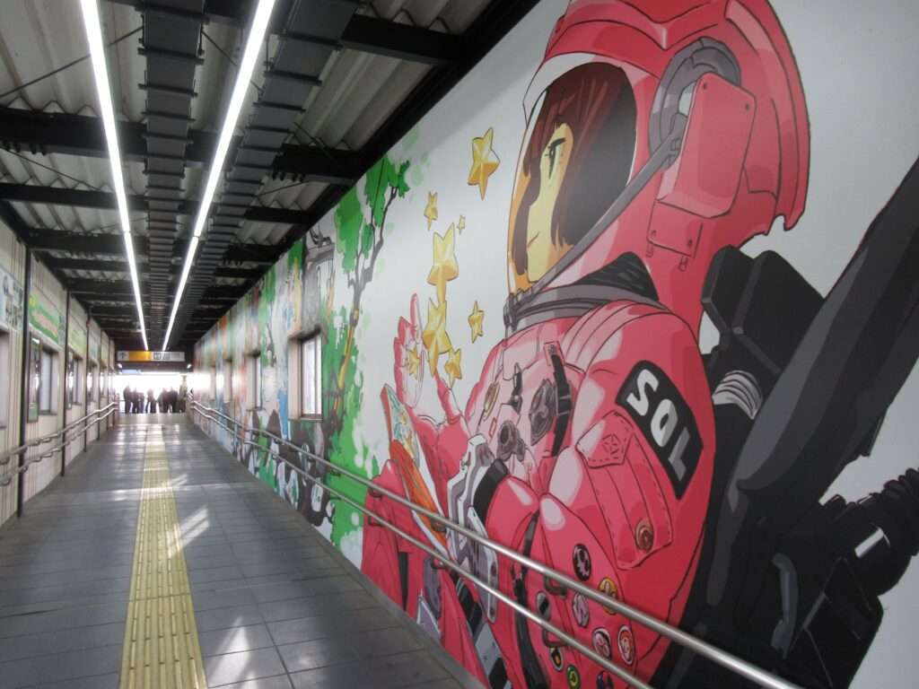 武蔵野線の東所沢駅構内、エレベーター連絡通路の壁面に描かれた巨大な壁画イラストでございます。これは埼玉県和光市出身のアニメーター、すしおさんが手掛けたものだそうで、作品名は「星に願いを」なのだそうですよ、そこの奥さん(←何処の奥さん?)。