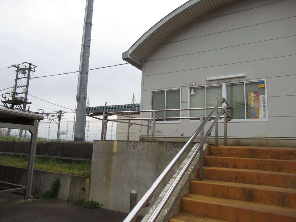 信越本線の押切駅でございます。複線電化区間にある単式島式複合型の2面3線、いわゆる国鉄型配線だったうちの中線を廃止した、単式2面2線の地上駅で、平屋の駅舎がある無人駅となっております。ホーム間は上屋付きの跨線橋で連絡しております。
