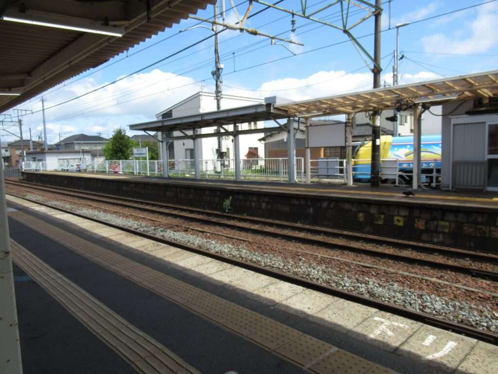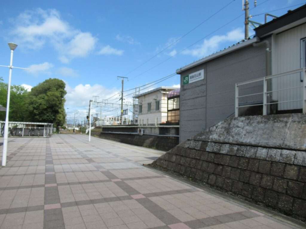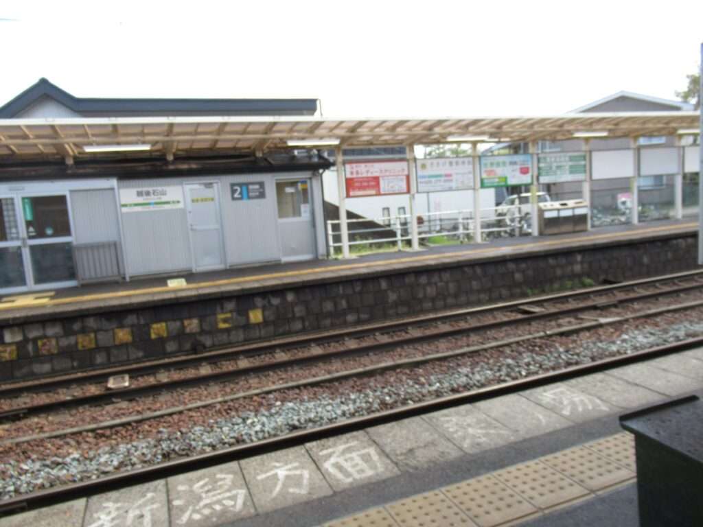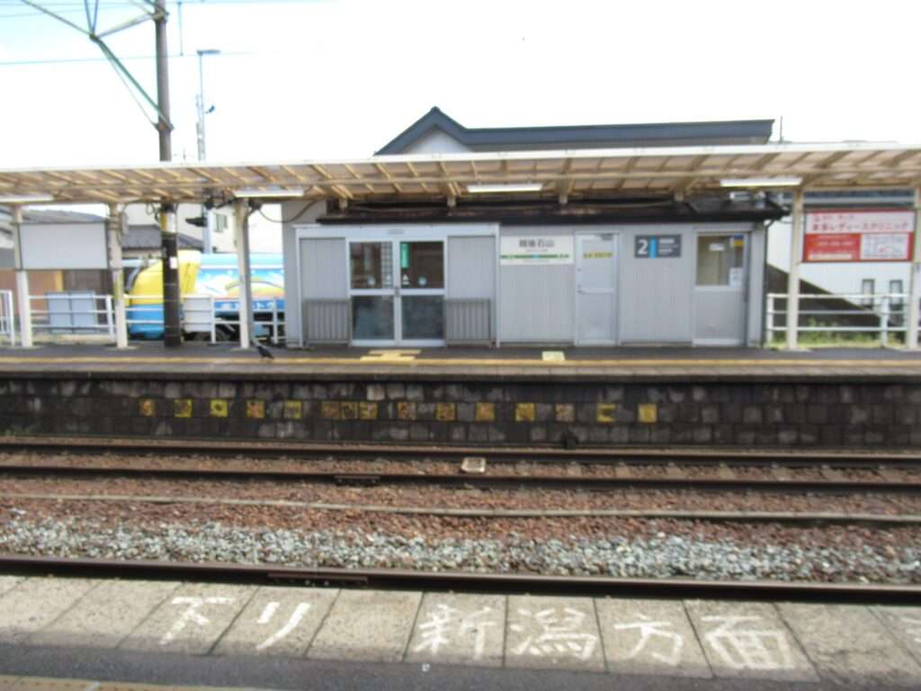 信越本線の越後石山駅でございます。複線電化区間にある相対式2面2線の地上駅で、両ホームに出入口があり、そのうち西口には駅舎があり有人改札がございます。東口には駅舎がなく無人改札となっております。改札内でのホーム間の連絡はなく、改札外に地下道が設けられております。自由通路を含む橋上駅化をする計画がございます。
