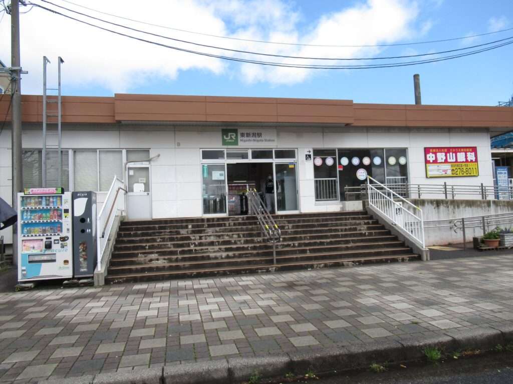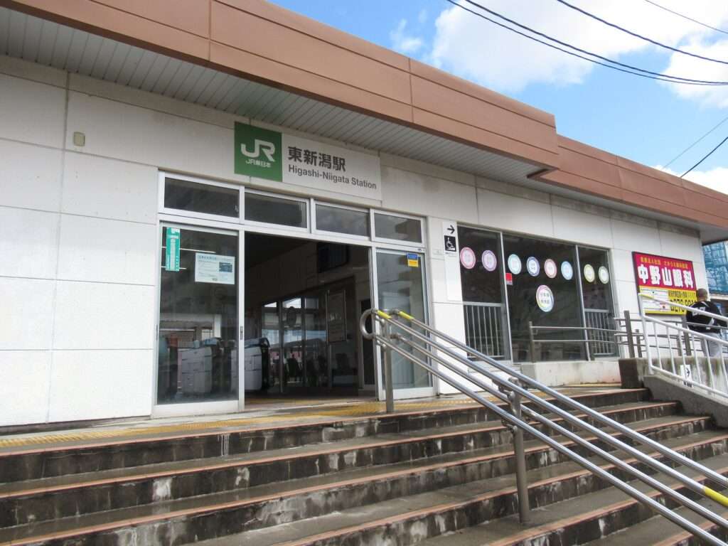 白新線の東新潟駅でございます。複線電化区間にある相対式2面2線の地上駅で、平屋の駅舎がある業務委託駅となっております。ホーム間は上屋付きの跨線橋で連絡しております。新潟貨物ターミナル駅が駅の背後に位置しております。
