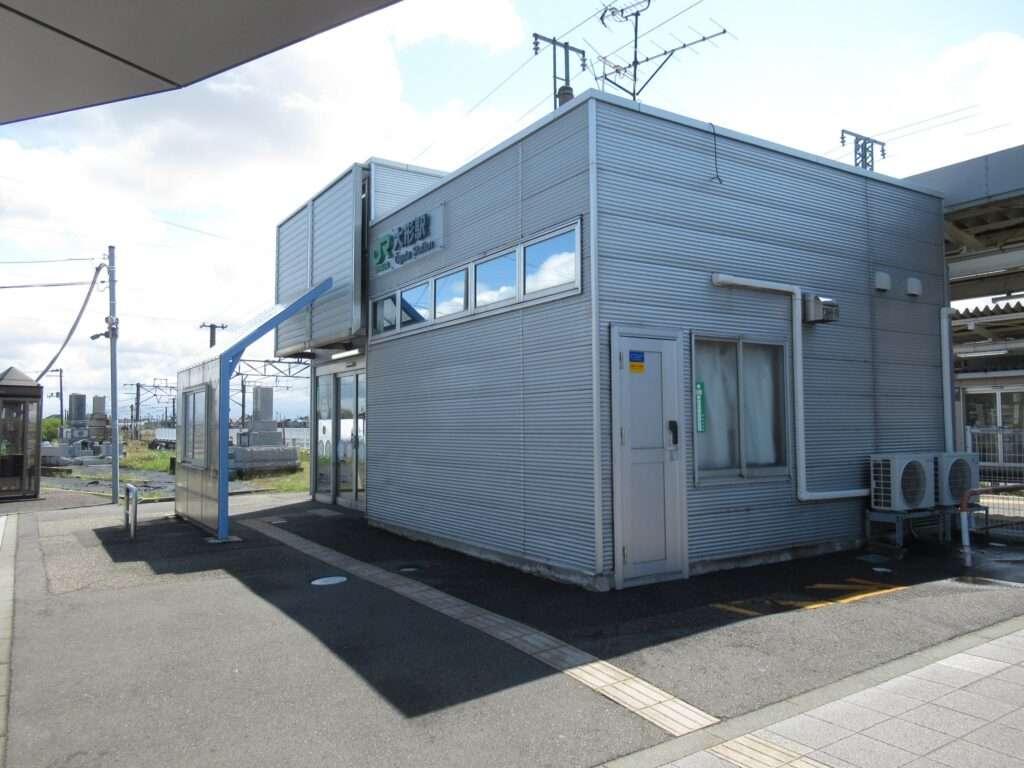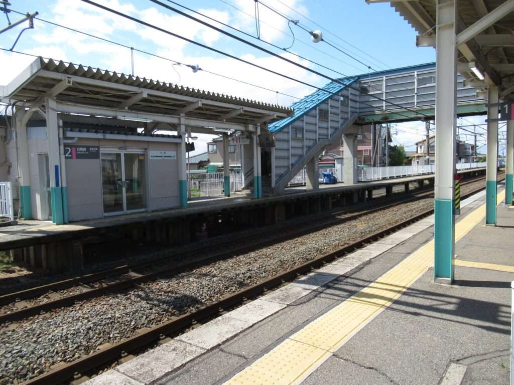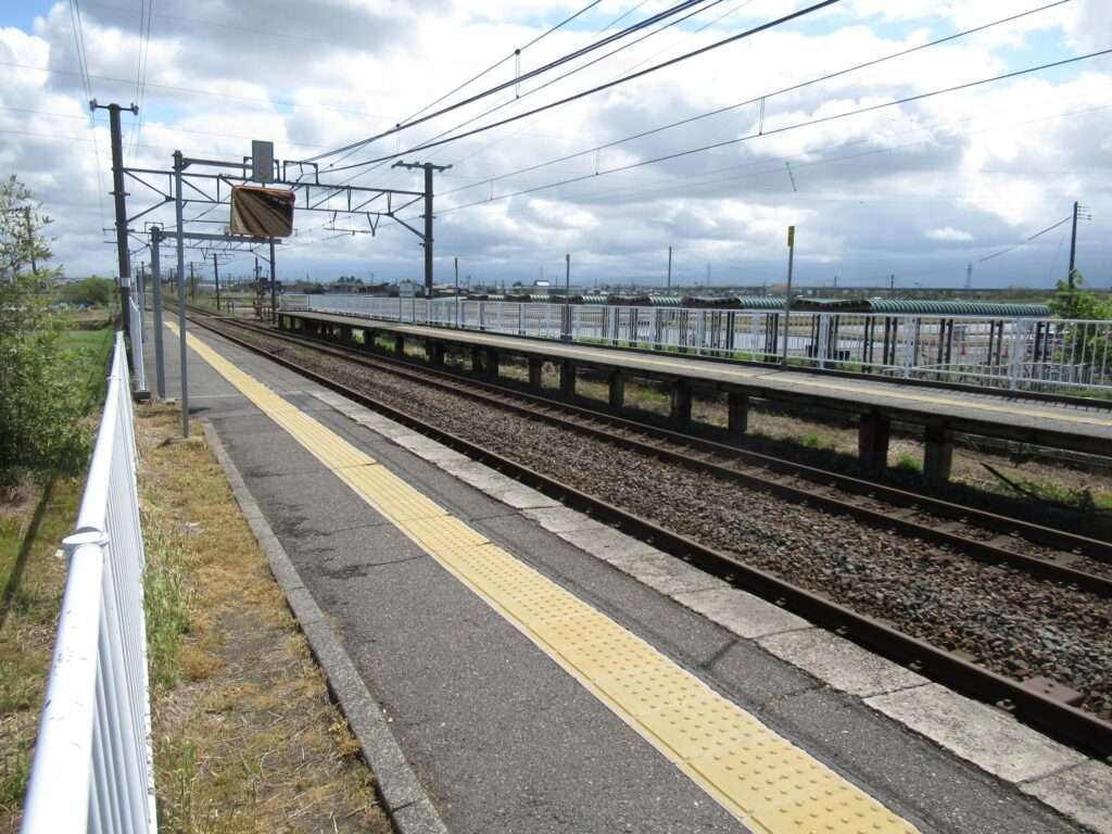 白新線の大形駅でございます。複線電化区間にある相対式2面2線の地上駅で、両ホーム共に簡易な駅舎がある業務委託駅となっております。ホーム間は上屋付きの跨線橋で連絡しております。新潟県立新潟北高校などの最寄り駅となっております。新潟空港に最も近い鉄道駅であり、駅名を新潟空港前に改称することも検討されておりましたが、約5kmの距離があるため流石に見送られたようでございます。
