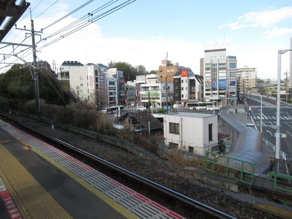 中央線の日野駅でごさいます。中央本線のうち運行系統上は中央線快速電車として運転される複線電化区間の、築堤上に設置されている島式1面2線の高架駅となっております。民家風平屋駅舎が地上1階にあり、築堤上のホームへは長い通路と階段またはエレベーターで連絡しております。