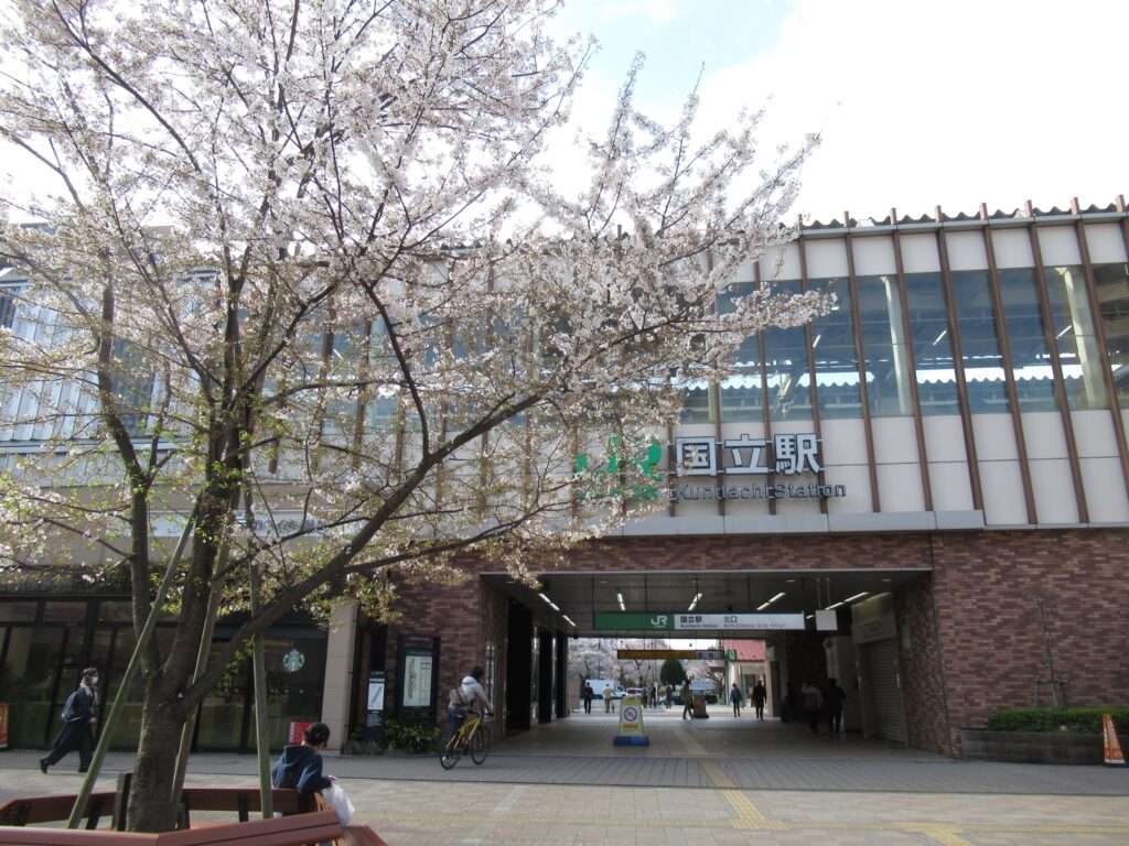 中央線の国立駅でごさいます。中央本線のうち運行系統上は中央線快速電車として運転される複線電化の高架線区間にある、単式島式複合型2面3線の高架駅となっております。新小平駅に向かう武蔵野線の国立支線が分岐しており、大宮駅へ直通する「むさしの号」が運行されております。南口から南武線の谷保駅まで通じている大学通りは桜の名所として有名でございます。北側にはJR総研国立研究所・鉄道情報システム中央システムセンターが立地しております。学校も多数あり、一橋大学国立キャンパスをはじめ、桐朋中学校・高等学校、東京都立国立高等学校、東京都立第五商業高等学校、学校法人NHK学園、国立音楽大学附属幼稚園・小学校・中学校・高等学校、東京都立国分寺高等学校などの最寄り駅となっております。
