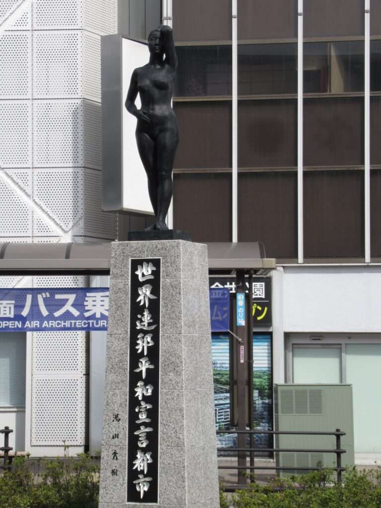 武蔵小金井駅北口にある世界連邦平和宣言都市の碑でございます。裸婦像が乗る世界連邦平和宣言都市と記された台座に湯川秀樹さんの名前が刻まれております。世界中の科学者・文化人たちが先導して世界から戦争をなくそうという趣旨の世界連邦の運動を進め、その一つとして「地方自治体が平和の尊さを訴え世界連邦建設の趣旨に賛同を表明する世界連邦都市宣言」を訴え、小金井市は市制施行の2年目の昭和35年に宣言を行い、その記念碑として建立されたというものなのでございますよ、そこの奥さん(←何処の奥さん?)。
