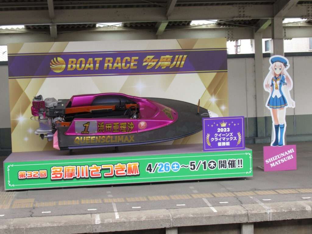 西武多摩川線の競艇場前駅の廃止された側のホーム上には多摩川競艇場の競技艇が展示されております。訪問時には2023クイーンズクライマックスの優勝艇が展示されておりました。ちなみにかつてのワタクシはボートレース、つまり競艇のファンでございまして、ここにも何度か来ております。いつもいつも、ひたすらオケラ街道を突き進む結果になってしまっておりましたんですよ。ところで、多摩川競艇場は川にあるのではなく、池にある競艇場なんですけどね。
