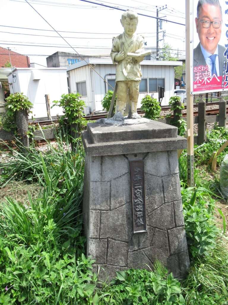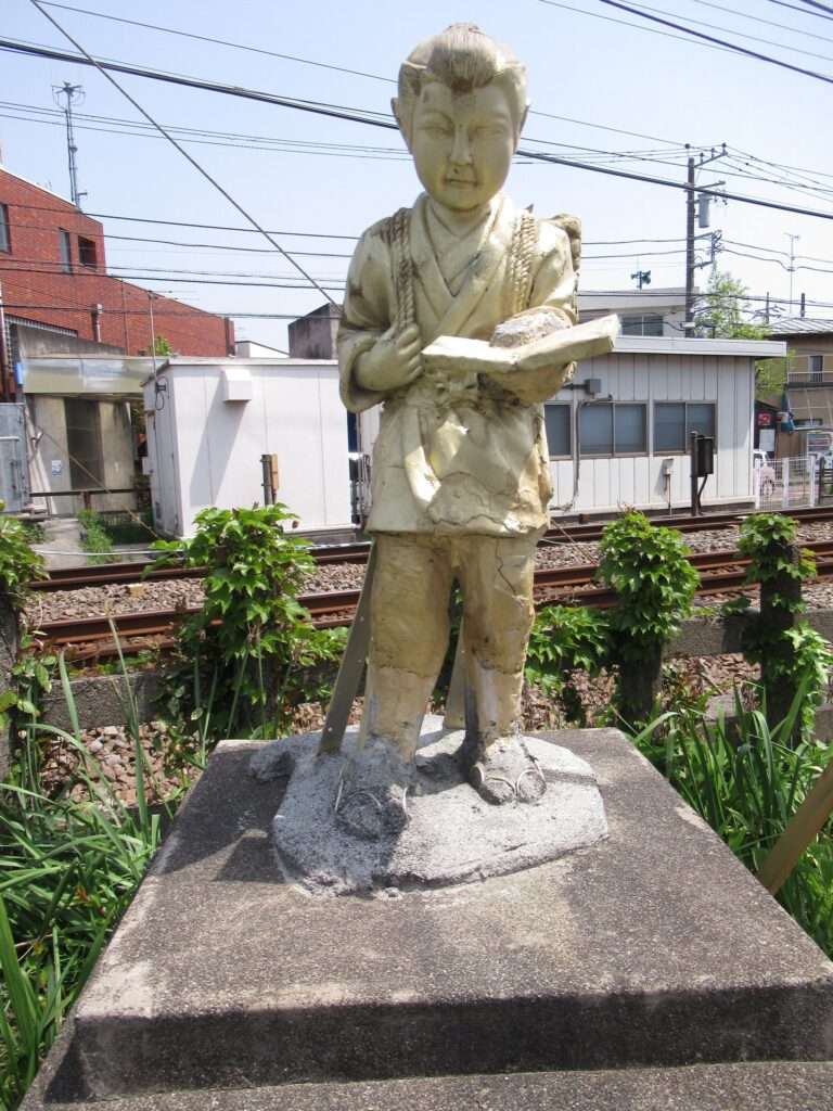 小田急電鉄小田原線の螢田駅前踏切の線路脇にあった少年二宮金次郎像でございます。これはコンクリート像に着色したものですな。