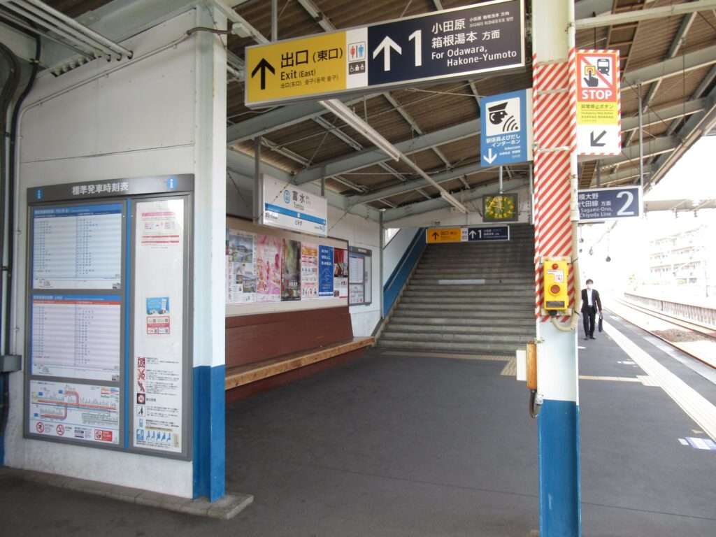 小田急電鉄小田原線の富水駅でございます。複線区間にある相対式2面2線の地上駅で、東西の両ホームに駅舎改札口があり、ホーム間は上屋付きの跨線橋で連絡しております。「とみみず」とは読まないのでございます。二宮金次郎こと二宮尊徳の生誕地および尊徳記念館の最寄り駅でございます。