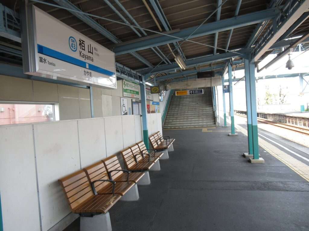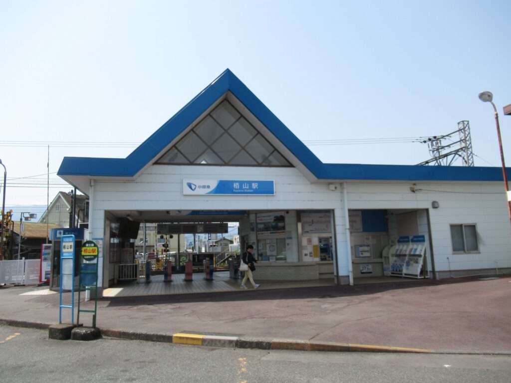 小田急電鉄小田原線の栢山駅でございます。複線区間にある相対式2面2線の地上駅で、東西両ホームに駅舎改札があり、ホーム間は上屋付きの跨線橋で連絡しております。隣の富水駅との中間辺りに二宮金次郎こと二宮尊徳生誕地があり、尊徳記念館、神奈川県立小田原城北工業高等学校、神奈川県立大井高等学校などの最寄り駅となっております。
