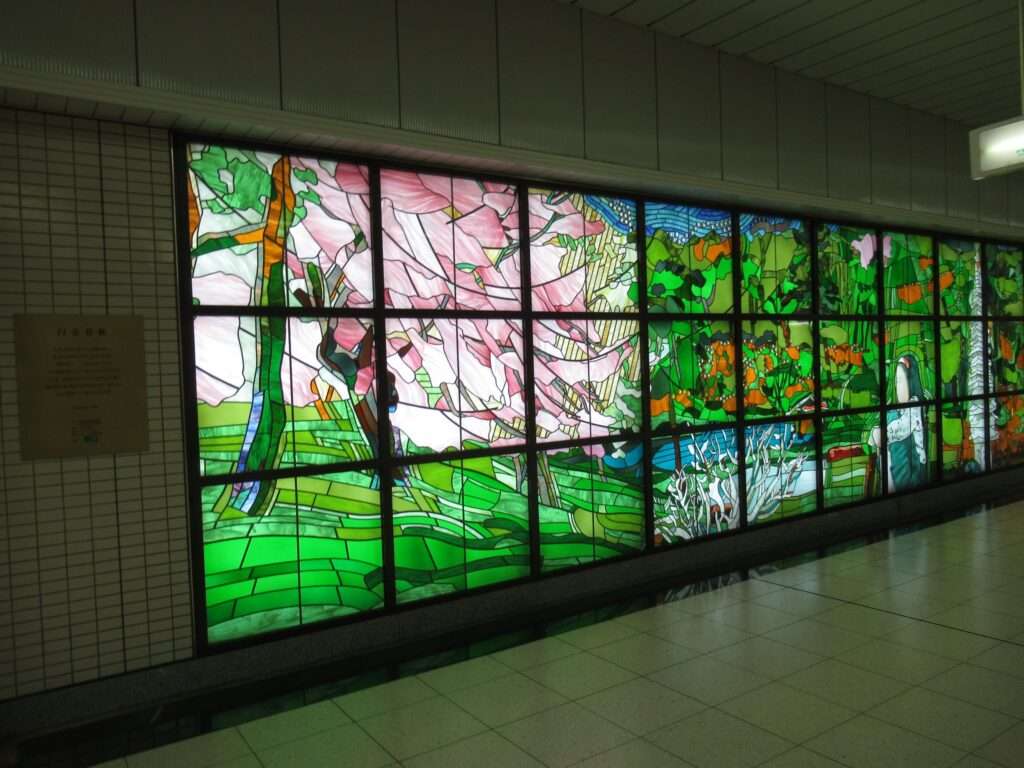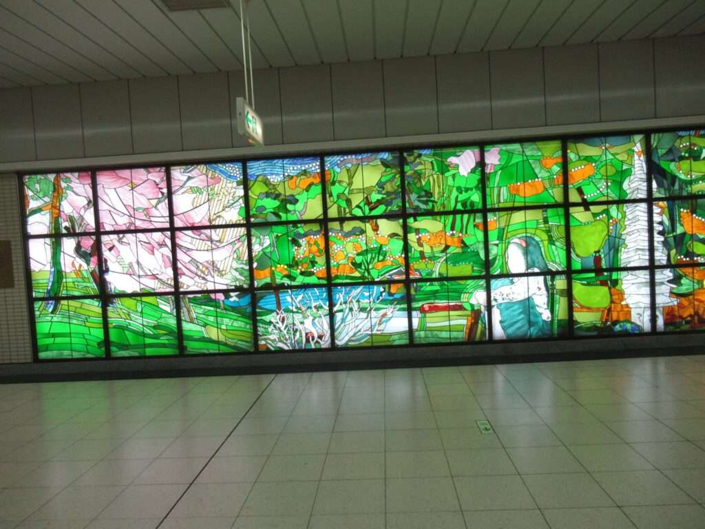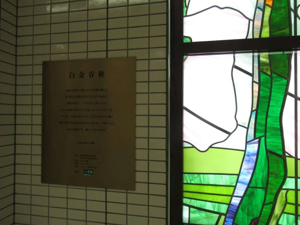 白金台駅の2番出口の改札内壁面にあるステンドグラスのパブリックアート、白金春秋でございます。洋画家の大津英敏さんの原画を元に作られたもので、八芳園の風景、庭に座る少女は大津英敏さんの娘さんがモデルなのだそうですよ、そこの奥さん(←何処の奥さん?)。
