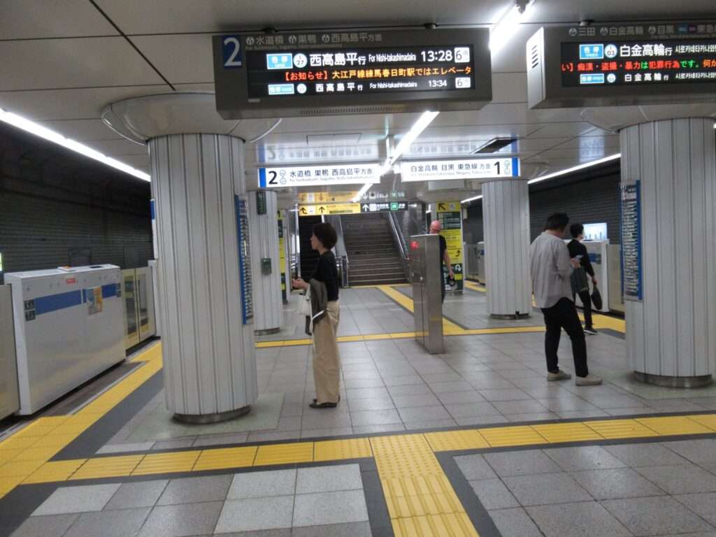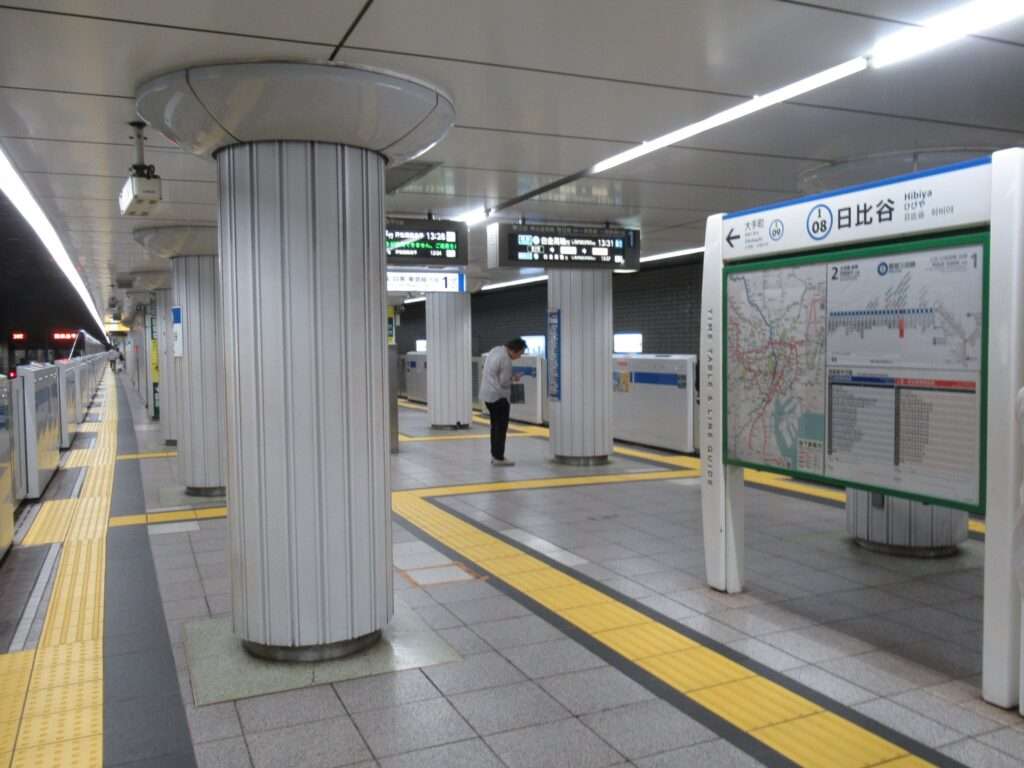 東京都交通局の都営地下鉄三田線の日比谷駅でございます。島式1面2線の地下駅となっております。東京メトロ日比谷線・千代田線との乗換駅となっており、さらに通路で有楽町線有楽町駅とも繋がっております。ホームは日比谷通りの直下にあり、地下通路は東側は銀座駅・東銀座駅まで、北側は大手町駅・東京駅まで繋がっております。