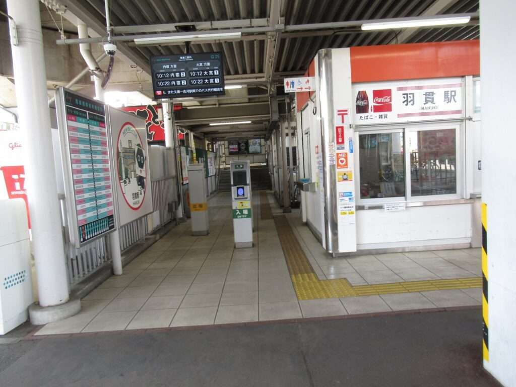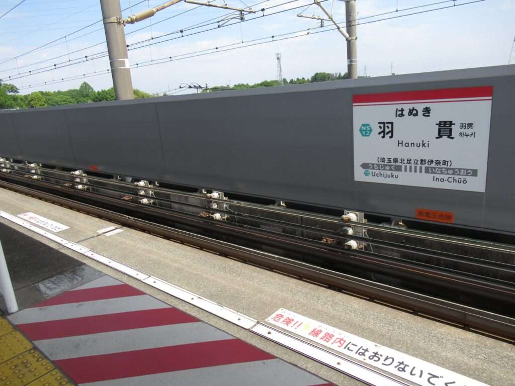 新交通システムAGTと呼ばれるゴムタイヤの案内軌条式鉄道路線、ニューシャトルこと埼玉新都市交通伊奈線の羽貫駅でございます。上越新幹線の高架西側に沿って敷設されている単線区間にある、列車交換可能な島式1面2線の高架駅となっております。駅舎と売店を兼ねている一部時間帯のみ有人となる改札口が高架下地上にございます。埼玉県立伊奈学園総合高等学校の最寄り駅となっております。