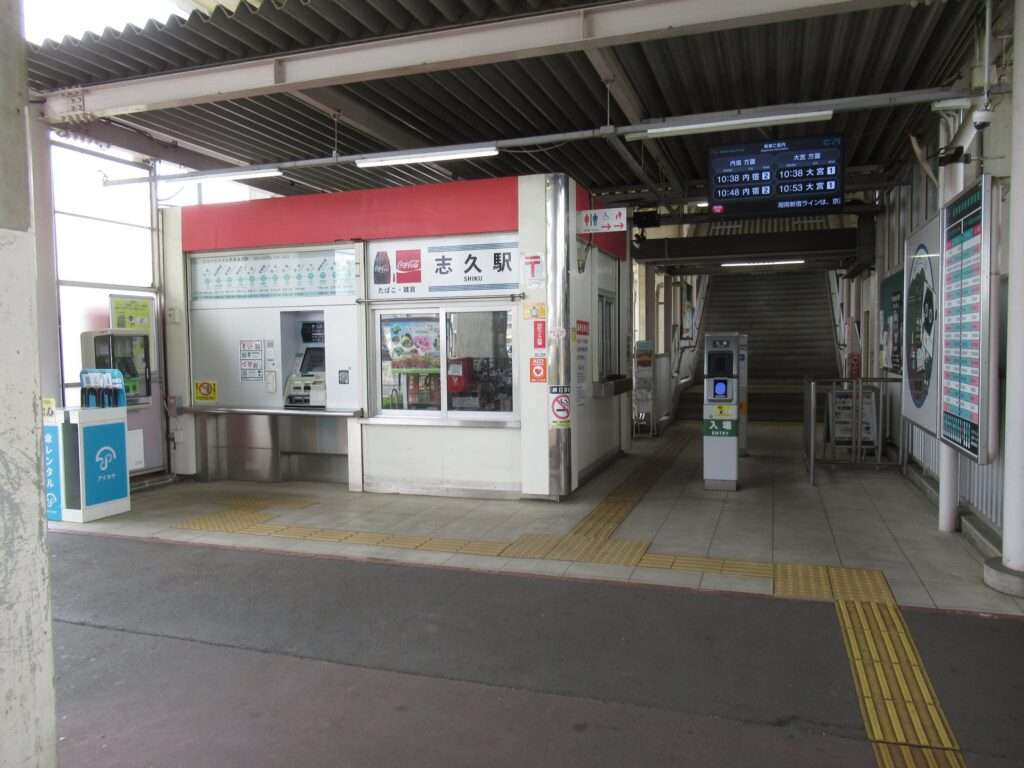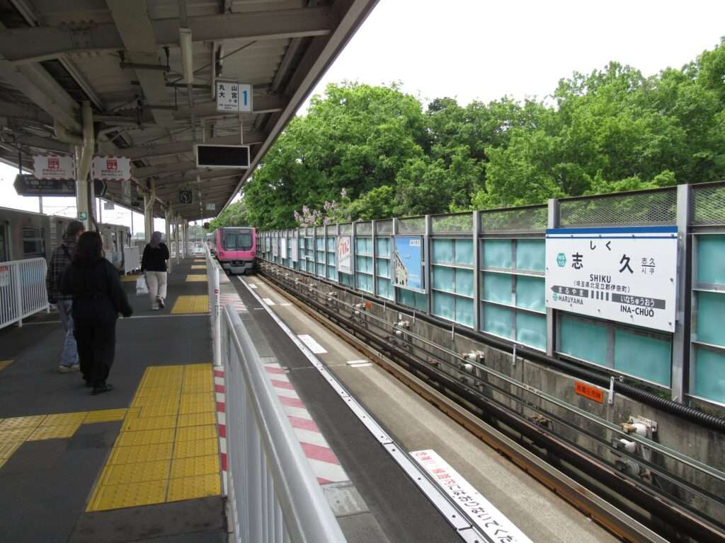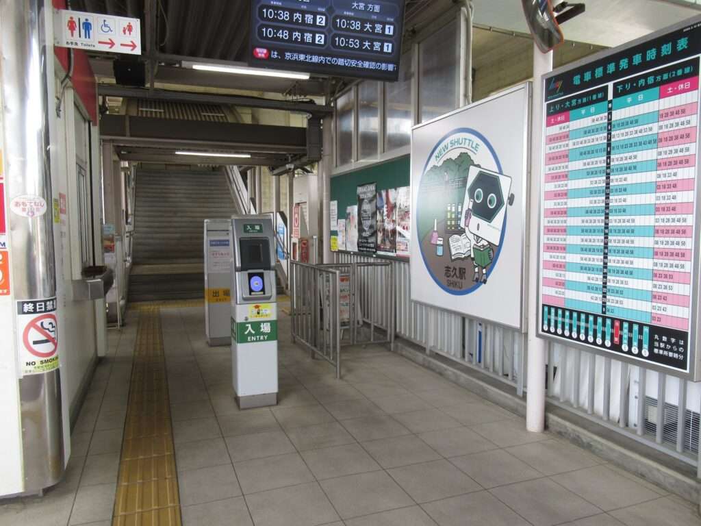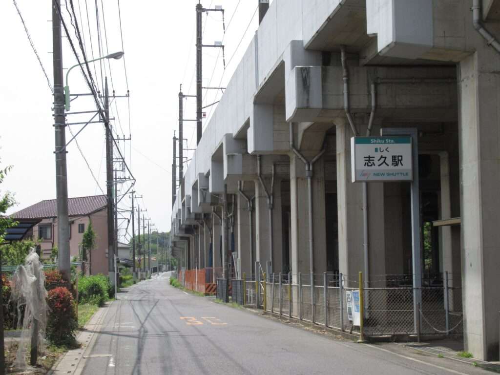 新交通システムAGTと呼ばれるゴムタイヤの案内軌条式鉄道路線、ニューシャトルこと埼玉新都市交通伊奈線の志久駅でございます。上越新幹線の高架西側に沿って敷設されている単線区間にある、列車交換可能な島式1面2線の高架駅となっております。駅舎と売店を兼ねている一部時間帯のみ有人となる改札口が高架下地上にございます。日本薬科大学、国際学院中学校・高等学校などの最寄り駅となっております。