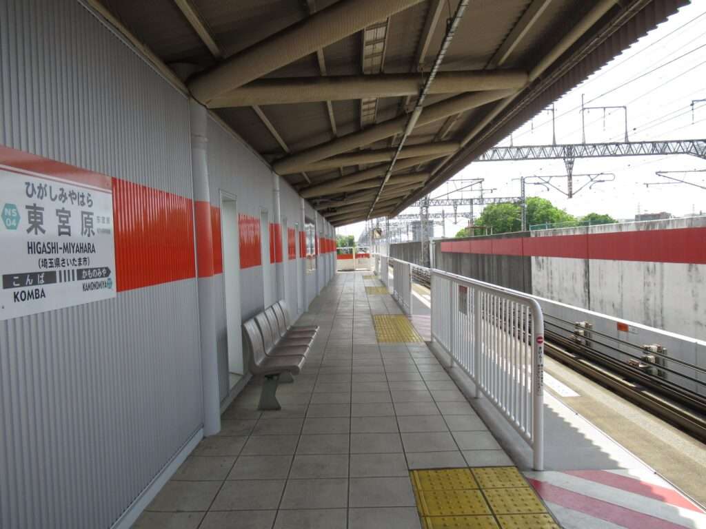 新交通システムAGTと呼ばれるゴムタイヤの案内軌条式鉄道路線、ニューシャトルこと埼玉新都市交通伊奈線の東宮原駅でございます。東北新幹線と上越新幹線を挟み込む形で敷設されている区間にある、相対式2面2線の高架駅となっております。駅舎と売店を兼ねている一部時間帯のみ有人となる改札口が高架下地上にございます。高崎線の宮原駅まで約800m程の距離に位置しております。