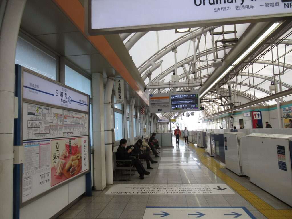 京成電鉄京成本線の日暮里駅でございます。3層構造になっており、地上に単式1面1線の上りホーム、高架部に有料列車と一般列車のホームを分けた相対式2面1線の下りホームがある、計3面2線となっております。2階に改札口・コンコースがございます。近年とみにインバウンド客が増加し、いつも大層混雑している印象でございます。