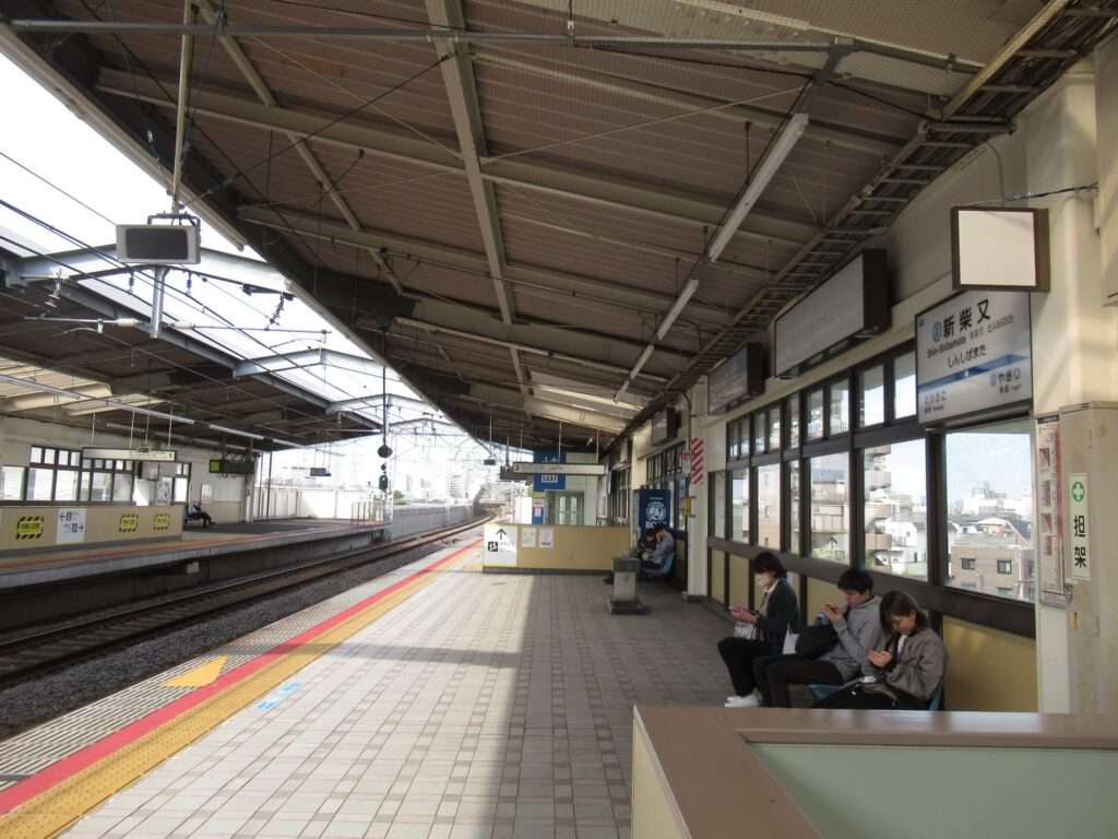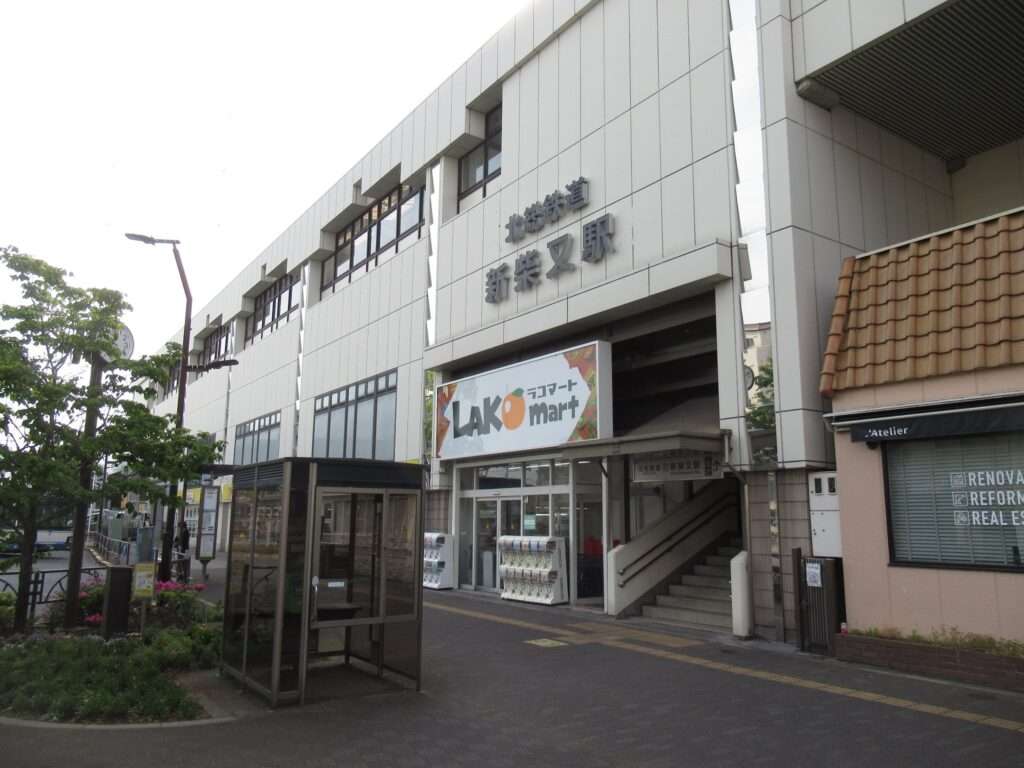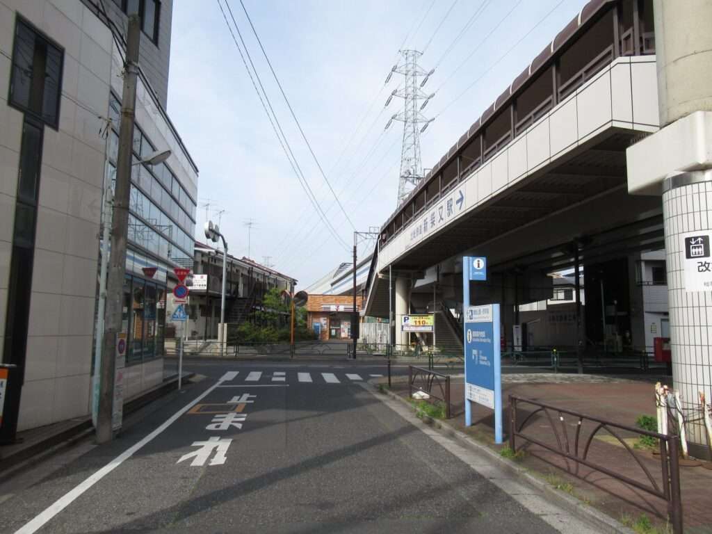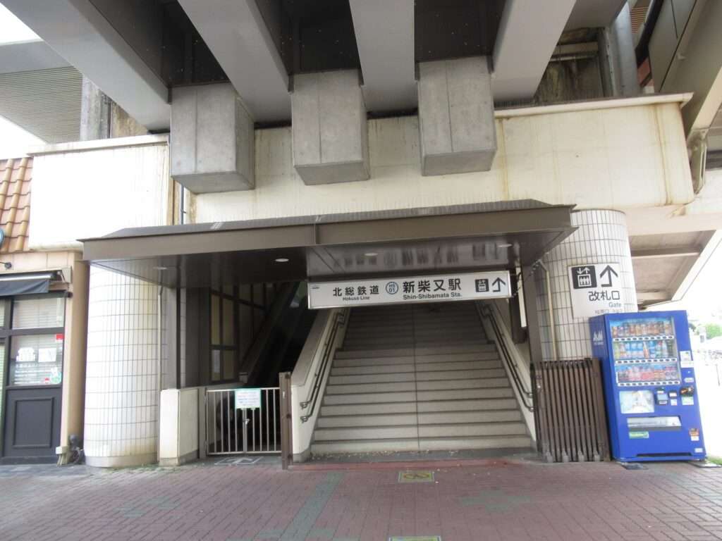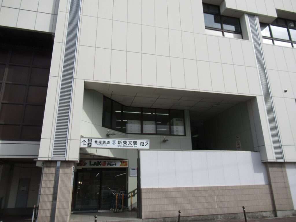 北総鉄道北総線の新柴又駅でございます。 成田スカイアクセス線こと京成成田空港線と線路を共用している区間ですが、北総線の普通列車のみが停車いたします。複線区間にある相対式2面2線の高架駅で、ホームは3階にあり、2階に改札口がございます。1階にはスーパーマーケット、店舗が入居しております。