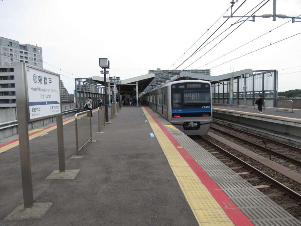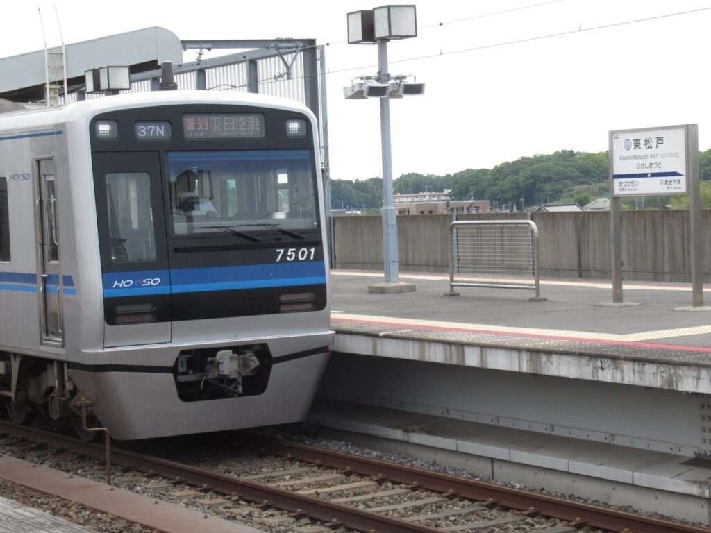 北総鉄道北総線と成田スカイアクセス線こと京成成田空港線の東松戸駅でございます。複線区間にある島式2面4線の高架駅で、武蔵野線の東松戸駅を跨いでおります。ホームは4階にあり、3階が改札コンコースでございます。武蔵野線の駅は北総線の駅から遅れること約7年、1998年(平成10年)に開業しております。千葉県立松戸南高等学校、松戸市立松戸高等学校などの最寄り駅となっております。