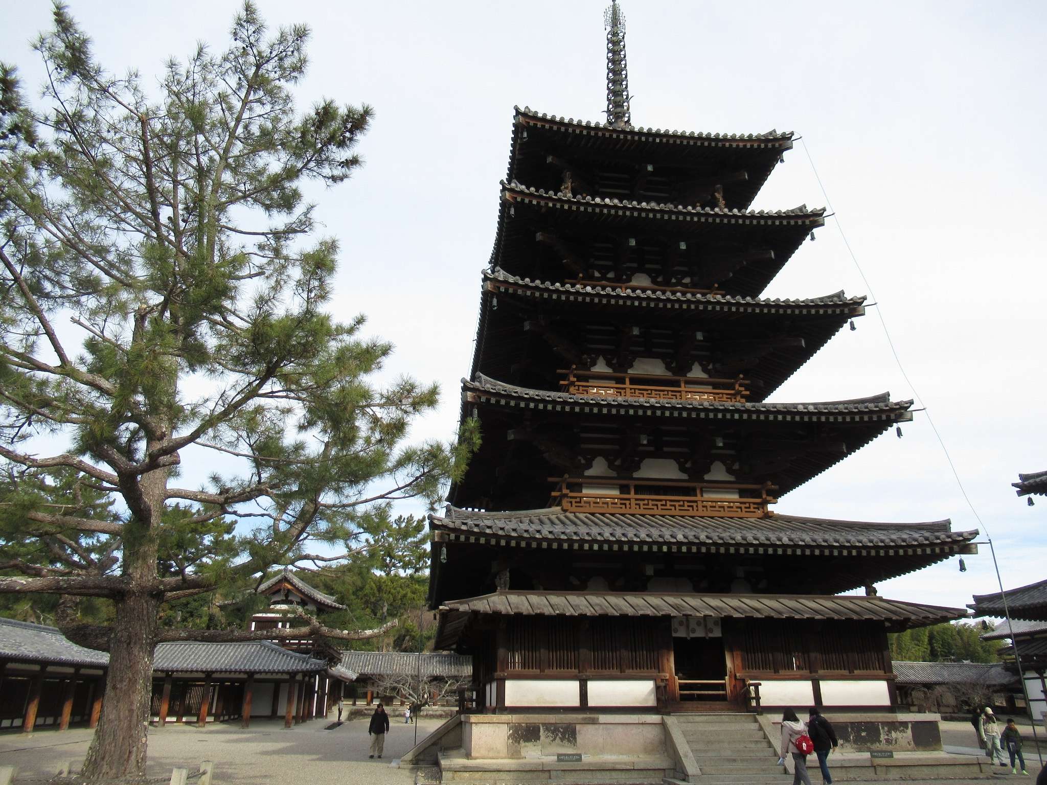 法隆寺の金堂でございます。国宝でございます。入母屋造の二重仏堂となっており、上層には部屋はなく、外観のみでございます。二重目の軒を支える四方の龍の彫刻を刻んだ柱は構造を補強するため修理の際に付加されたものだそうでございます。金堂の壁画は日本の仏教絵画の代表作として国際的に著名なものでしたが、1949年(昭和24年)壁画模写作業中の火災で初層内陣の壁と柱を焼損してしまい、この火災がきっかけで文化財保護法が制定されたという経緯がございます。