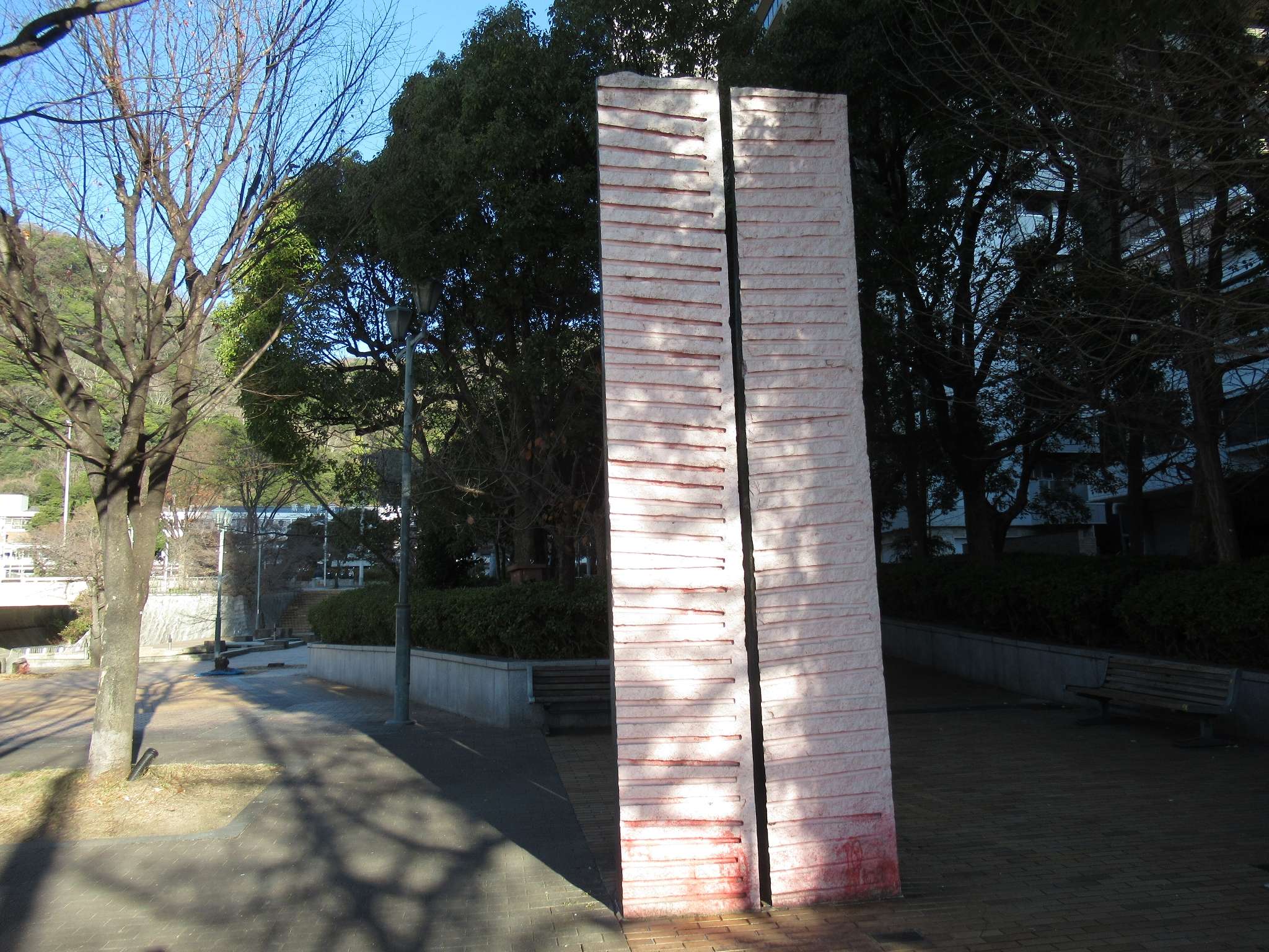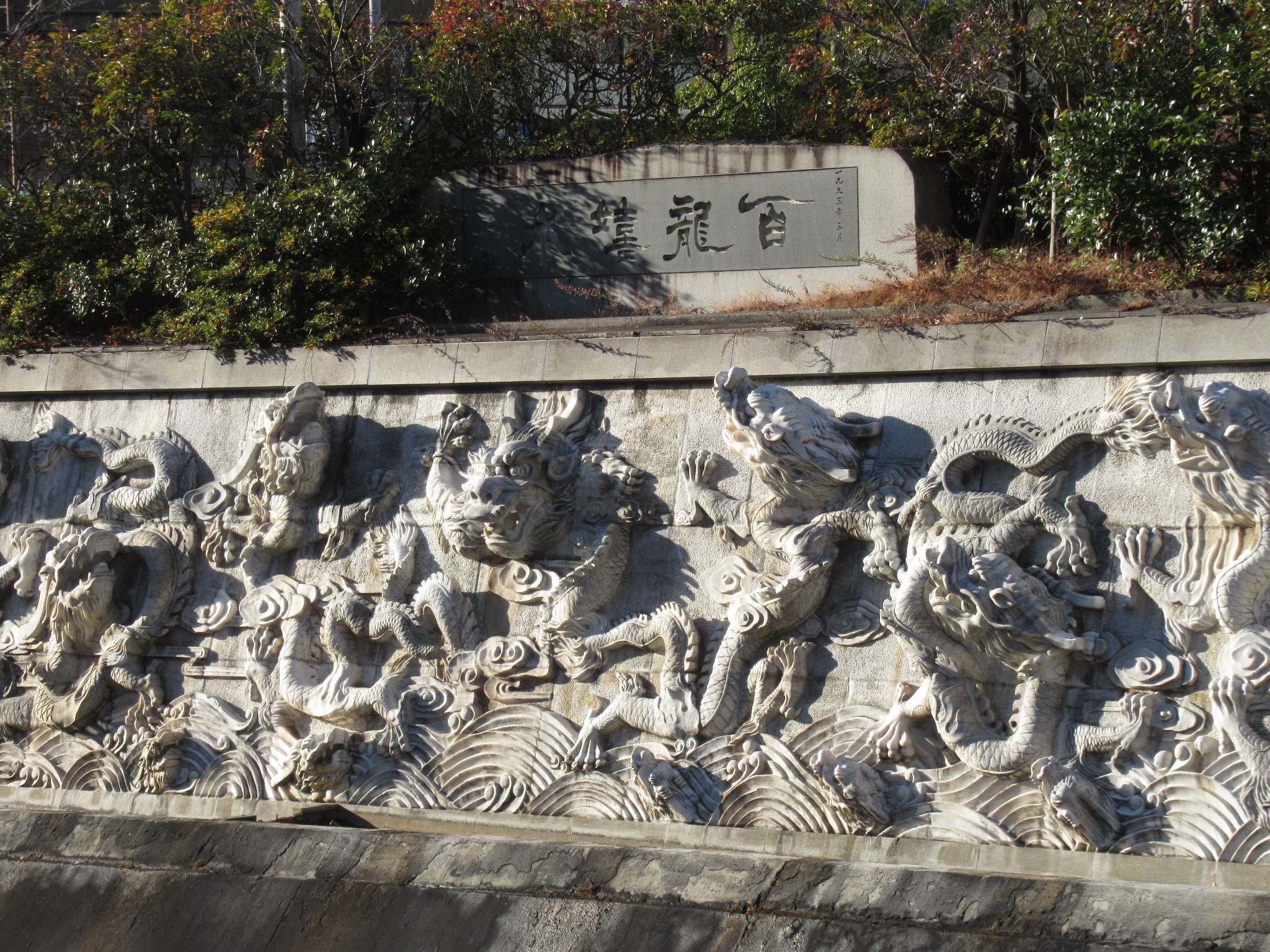 山陽新幹線新神戸駅の真下から流れる生田川でございますが、東海道本線と阪急神戸本線を経て西国街道である中央幹線道路辺りまで、生田川公園として整備されております。その生田川公園にある中国清時代の建物をモチーフにした二連のあずまや、連翼亭でございます。これも百龍嬉水と同じく友好都市提携20周年を記念して天津市から神戸市に贈られたものなのだそうですよ、そこの兄さん(←誰や?)。