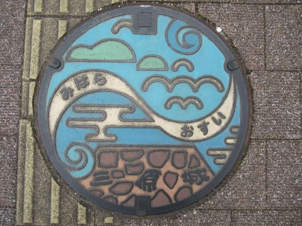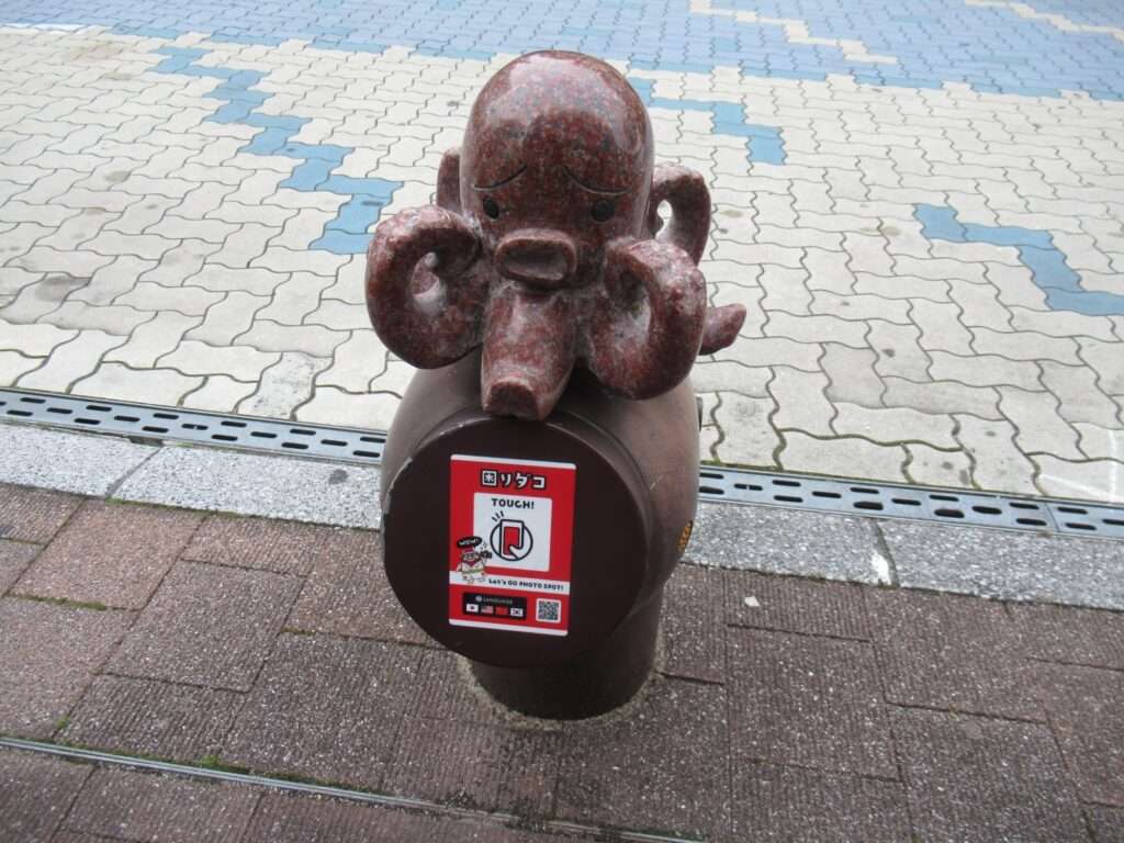 三原駅南口から三原港へ向かう道、マリンロードでございますが、ここの道の両サイド、船舶係留の柱をモチーフにした車止めには、三原市の特産物であるタコの像が勢揃いし、ユニークな石像シリーズになっております。全部で10体あるうちの一つ、「恋人ダコ」でございます。