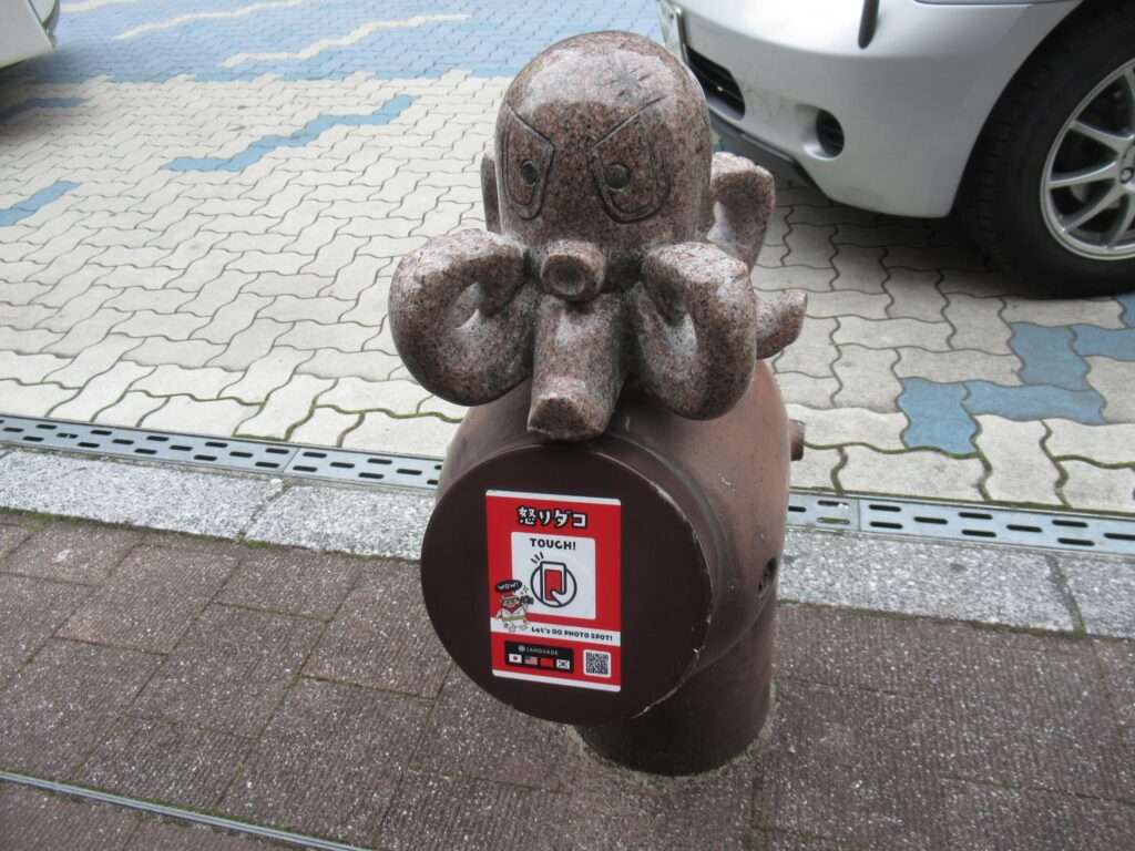 三原駅南口から三原港へ向かう道、マリンロードでございますが、ここの道の両サイド、船舶係留の柱をモチーフにした車止めには、三原市の特産物であるタコの像が勢揃いし、ユニークな石像シリーズになっております。全部で10体あるうちの一つ、「びくびくダコ」でございます。