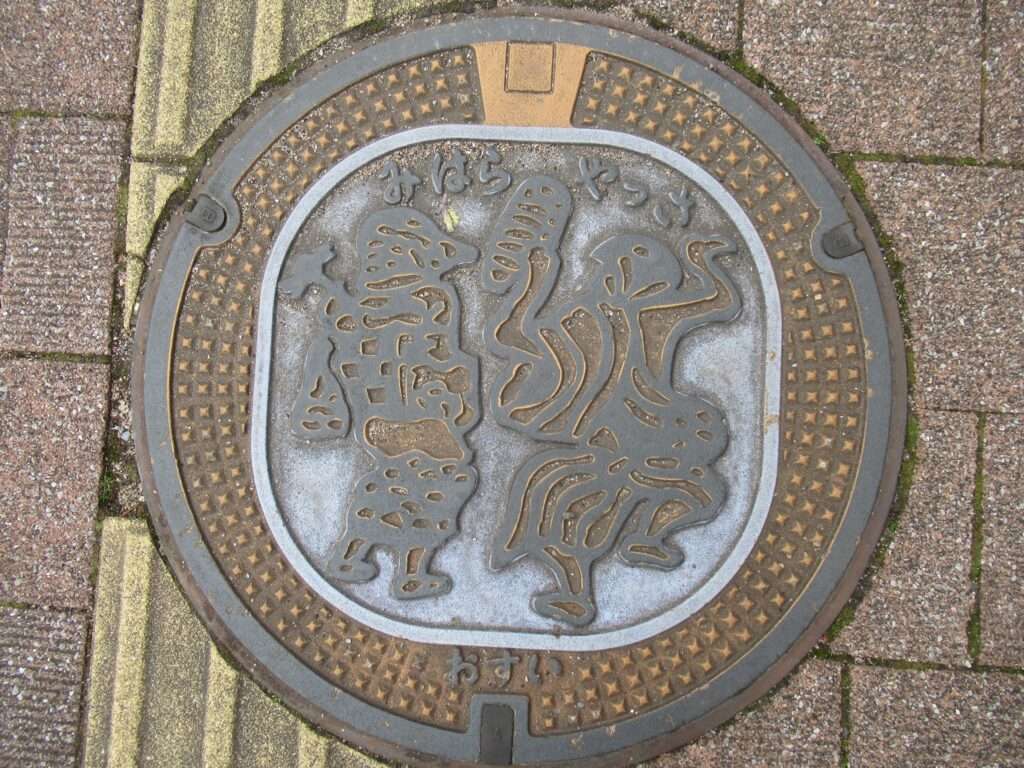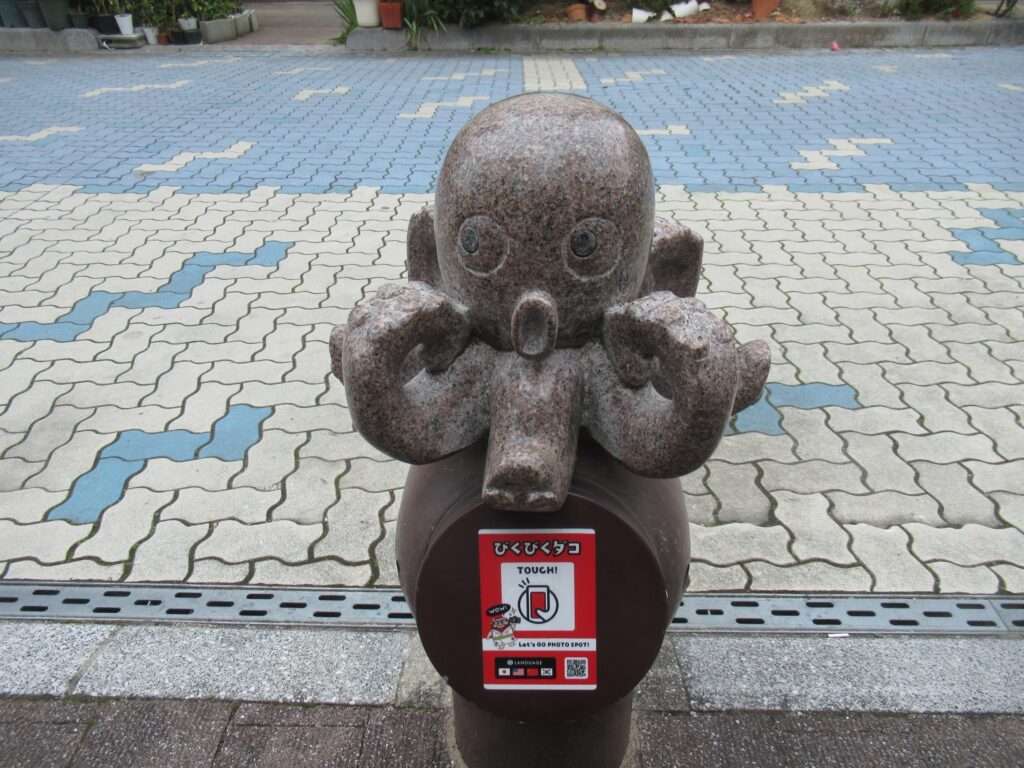 三原駅南口から三原港へ向かう道、マリンロードでございますが、ここの道の両サイド、船舶係留の柱をモチーフにした車止めには、三原市の特産物であるタコの像が勢揃いし、ユニークな石像シリーズになっております。全部で10体あるうちの一つ、「泣きダコ」でございます。