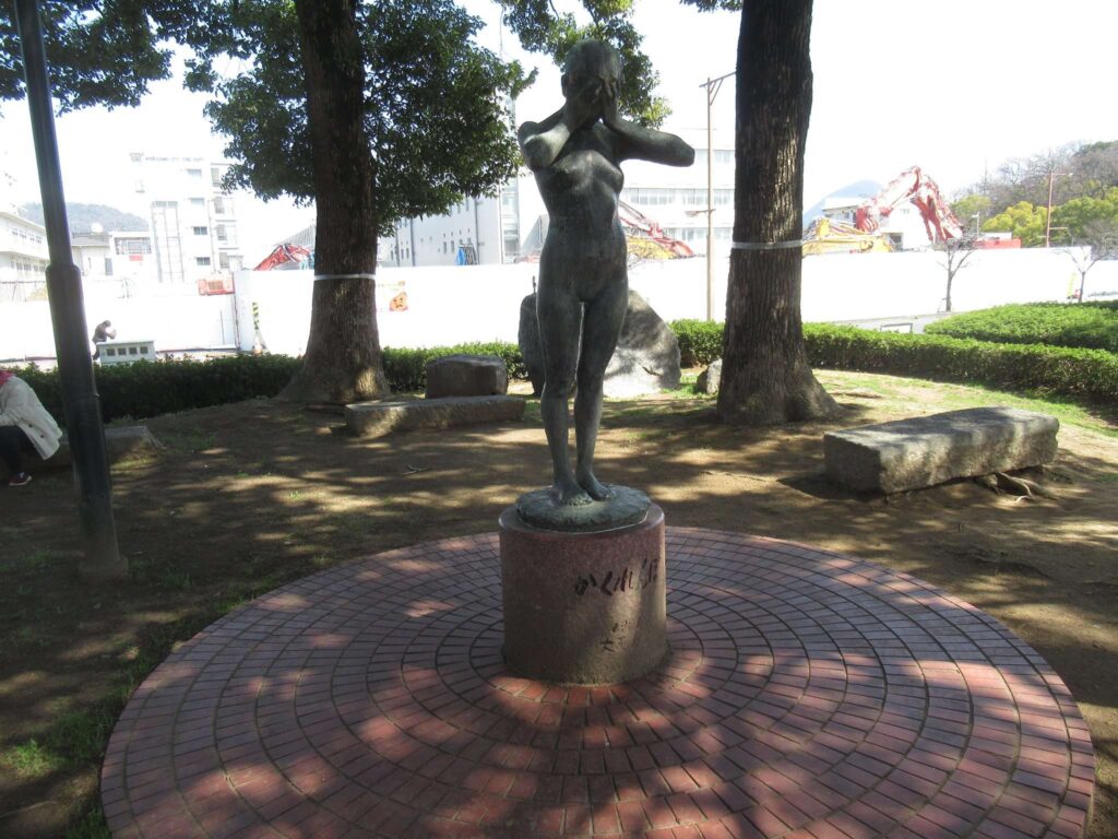 高松中央公園の高松駅方向から見て手前側、高松市役所近くの番町交差点地下通路の光の広場でございます。この交差点は国道が直交している交通量が多い交差点であるためか地上には横断歩道がないため、東西南北どちらへ渡るにしてもこの地下通路の光の広場を経由する必要がございます。地下広場の中央部には現代アート風の彫刻モニュメントがあります。これは「親しみのある光」というタイトルの福家靖夫さんという方の作品でございますですな。