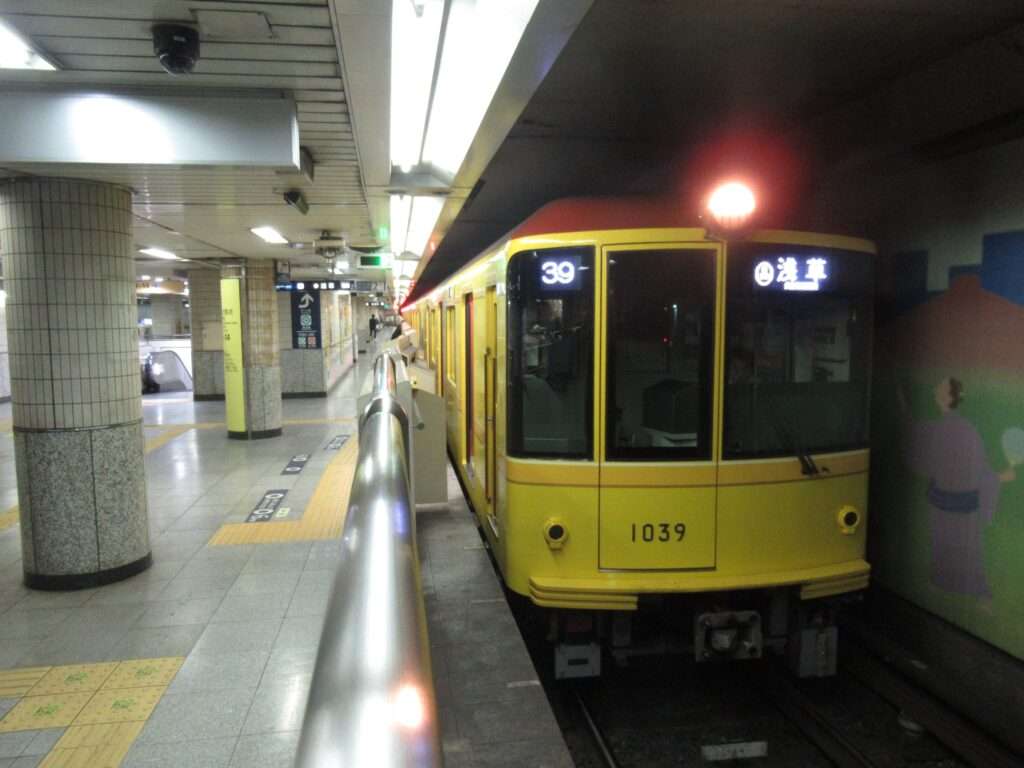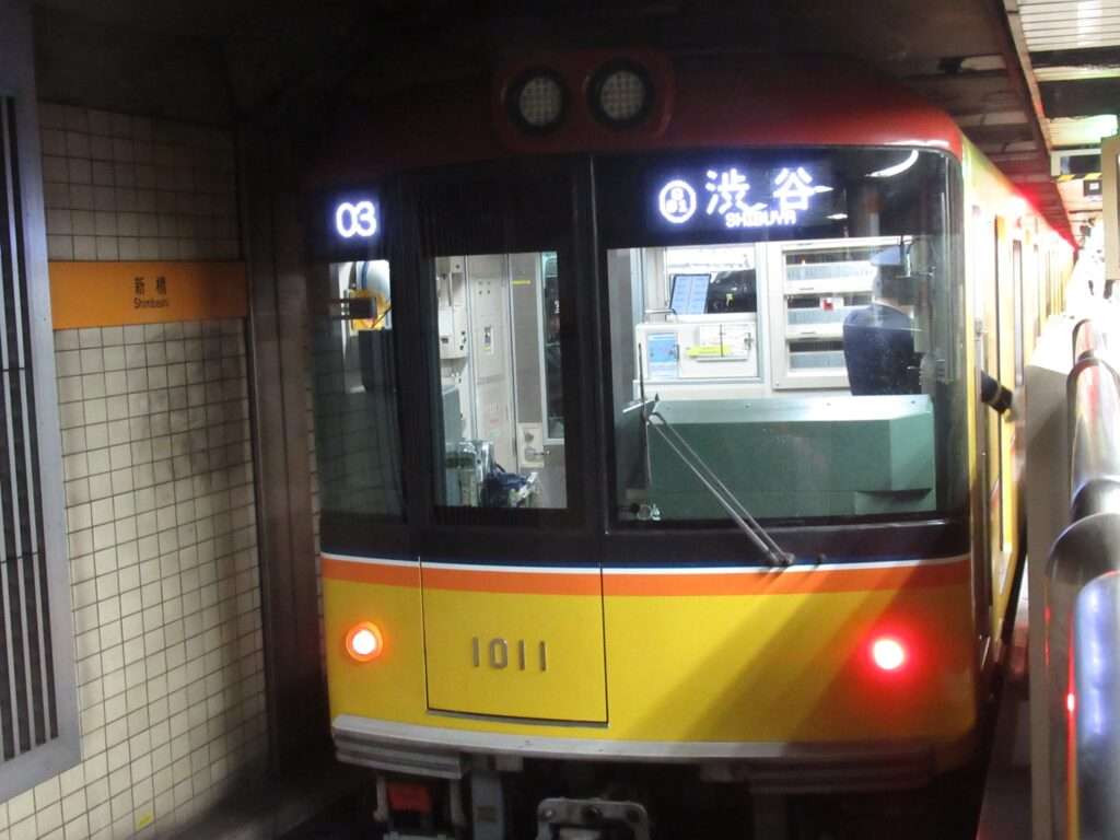 東京メトロこと東京地下鉄銀座線の銀座駅でございます。ホームが銀座通りこと中央通りの地下2階にある島式1面2線の地下駅となっております。晴海通りの地下3階にある日比谷線のホームを介して丸ノ内線とも改札内で連絡しております。
