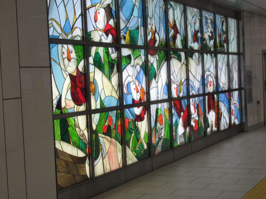東京メトロこと東京地下鉄副都心線の北参道駅の改札前に設置されているパブリックアート、「晴のち雨のち晴」でございます。吉武研司さんの作品による陶板タイル壁画でございます。この方は成田空港第2ビル駅の壁画も制作されたそうでございますね。「想像してごらん 地球と生きものたちのこと 共につながり 共に生き 循環していることを」と記されております。